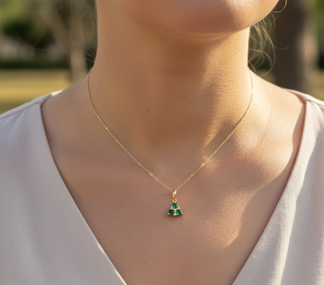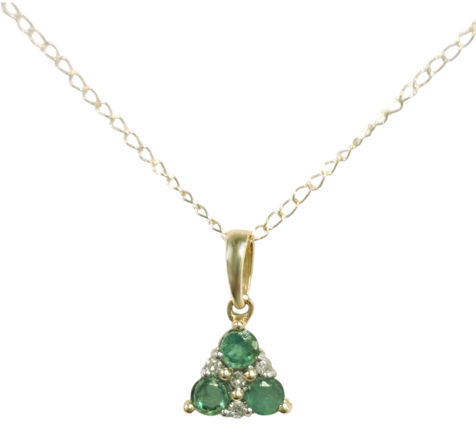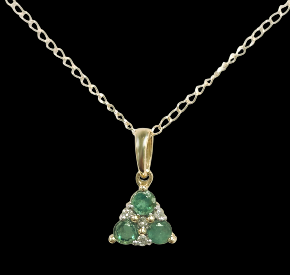 This dainty emerald necklace features 3 emerald gemstones with diamond accents set in 14K gold. The 4 small diamond accents weigh .02 CTW. The chain is also 14K gold and 20 inches in length. This small emerald pendant measures approximately .25 inches wide by .4 inches tall including the bail at the top.