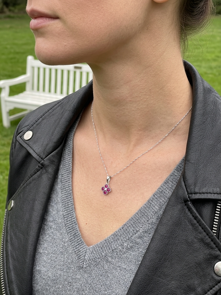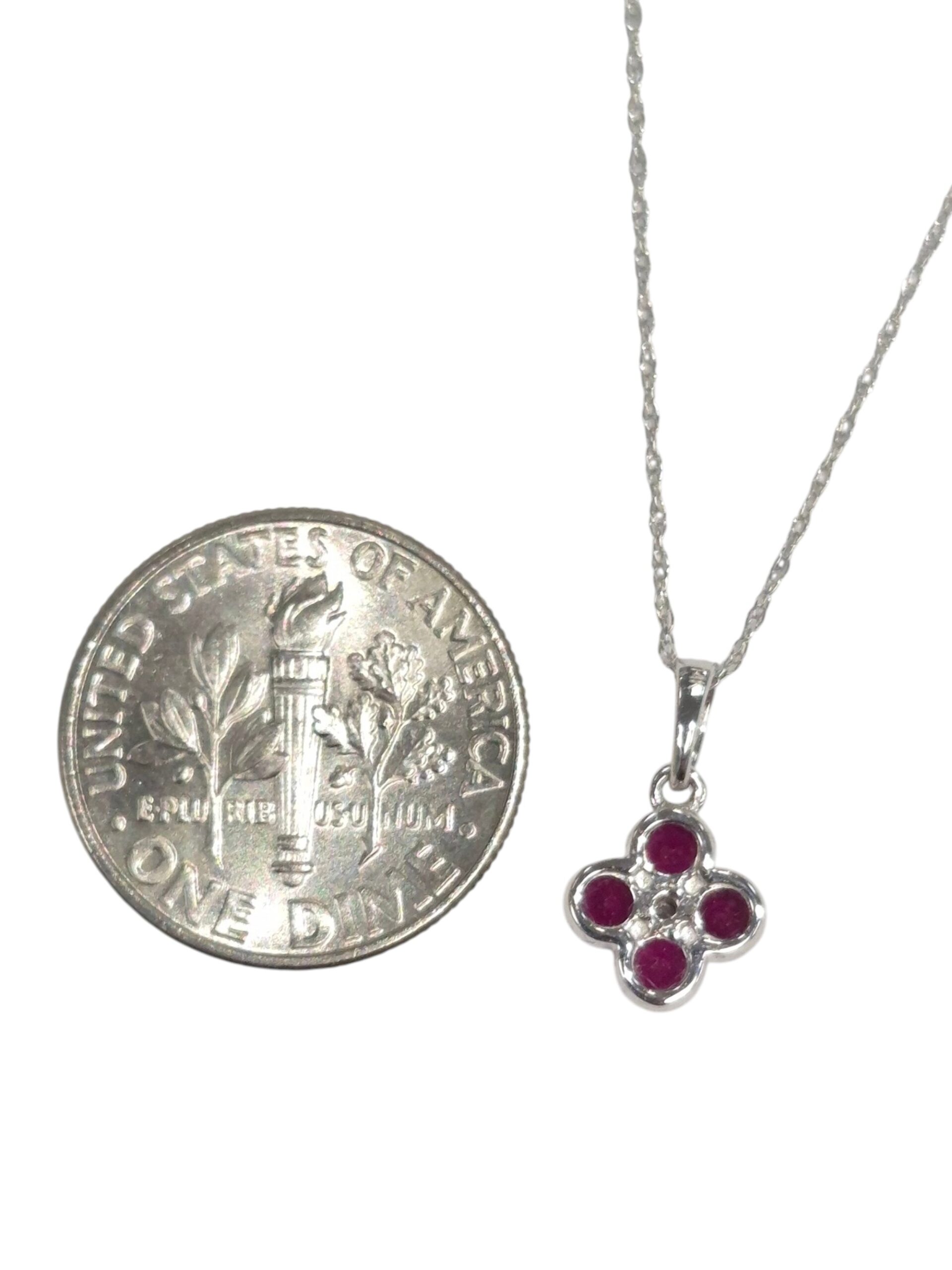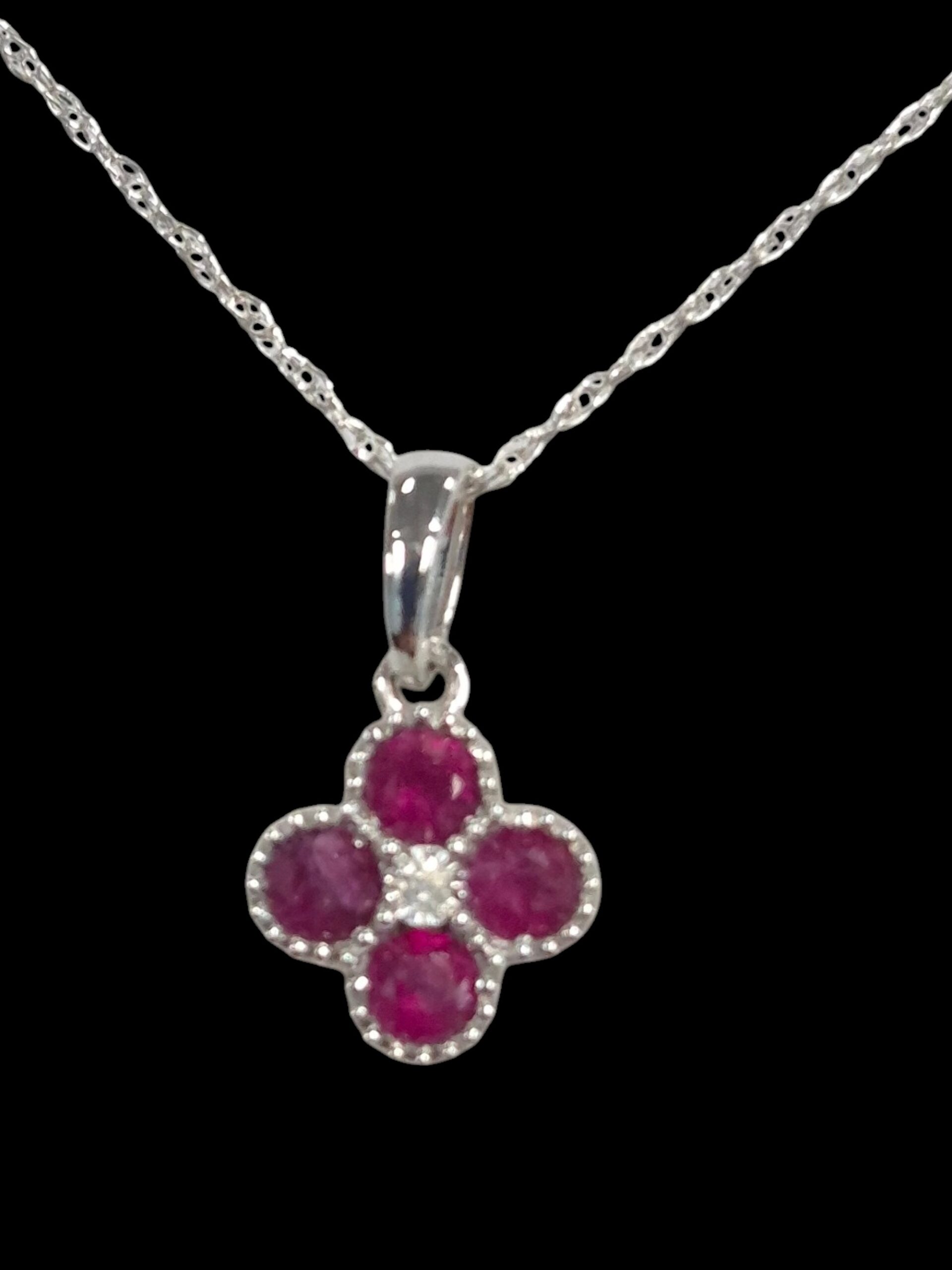 This dainty diamond and four ruby necklace features 4 red ruby gemstones with a tiny diamond accent set in 14K white gold. The small diamond accent weighs .01 CT. The chain is also 14K white gold and 18 inches in length. This small ruby pendant measures approximately .3 inches wide by .5 inches tall including the bail at the top.