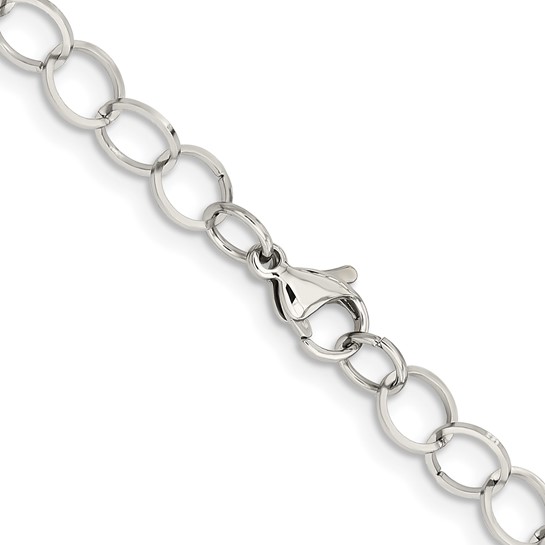This stainless steel circle link necklace has a simple modern look that would allow it to be worn often. The chain is 22 inches long. Each link is an 8 MM circle, which would allow the clasp to be clipped into any of the circles and the length to be worn shorter if desired.