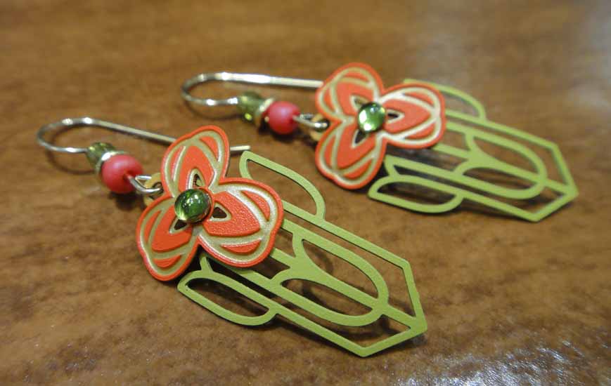 These orange poppy earrings are inspired by art nouveau style. They feature a stylized bright orange poppy flower with bright green leaves. These art nouveau inspired earrings have hypoallergenic gold-fill ear-wires. These earrings measure approximately 1.75 inches long (including the ear-wire) by 0.6 inches wide.