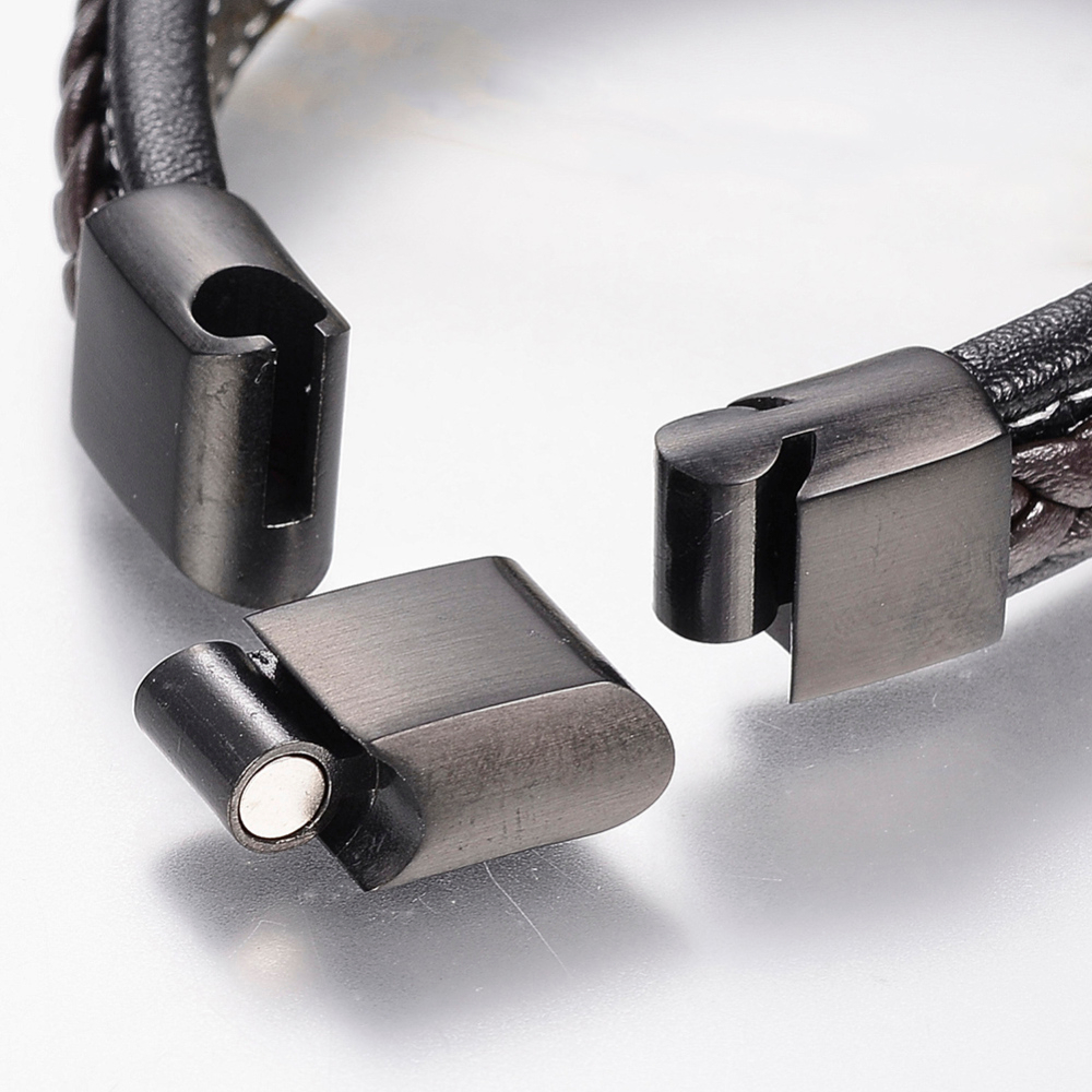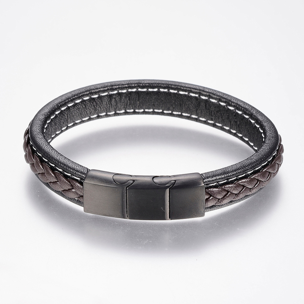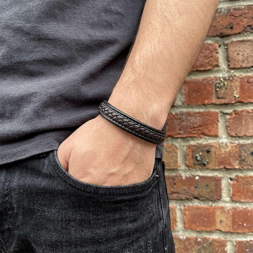 This unisex leather bracelet is on trend. It is made from black and brown leather with a black stainless steel clasp. The center is braided brown leather with black leather edges.