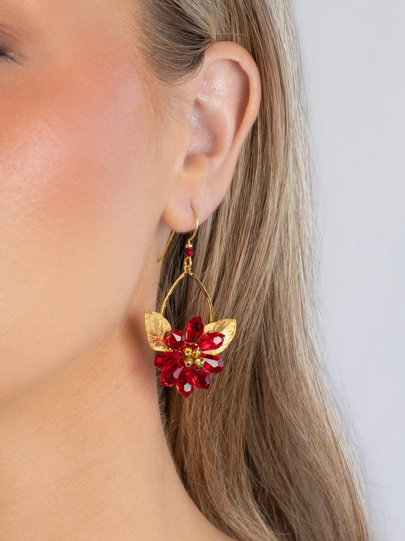 These poinsettia earrings are perfect for the holidays. Bright red crystals are used for the flower petals.