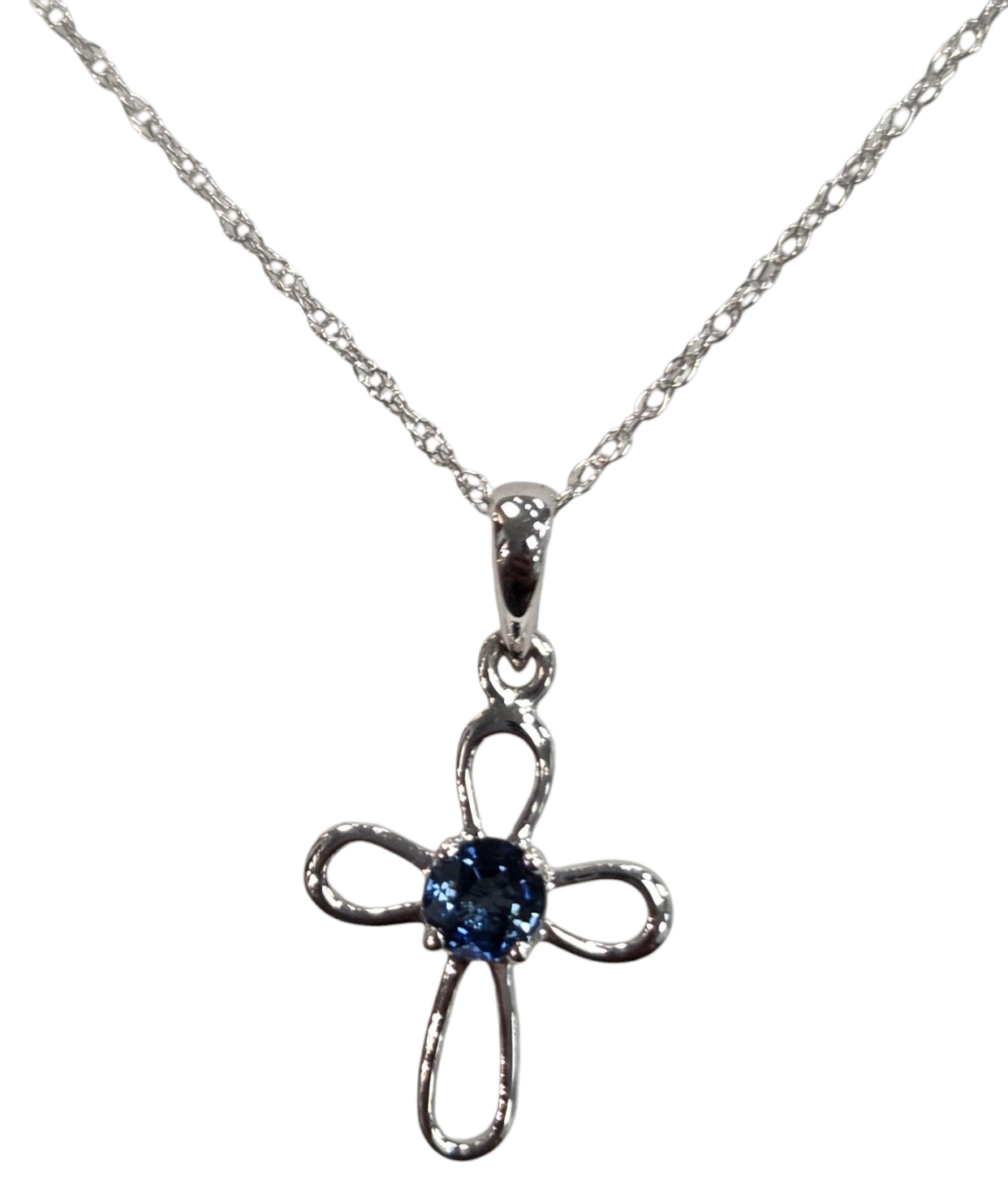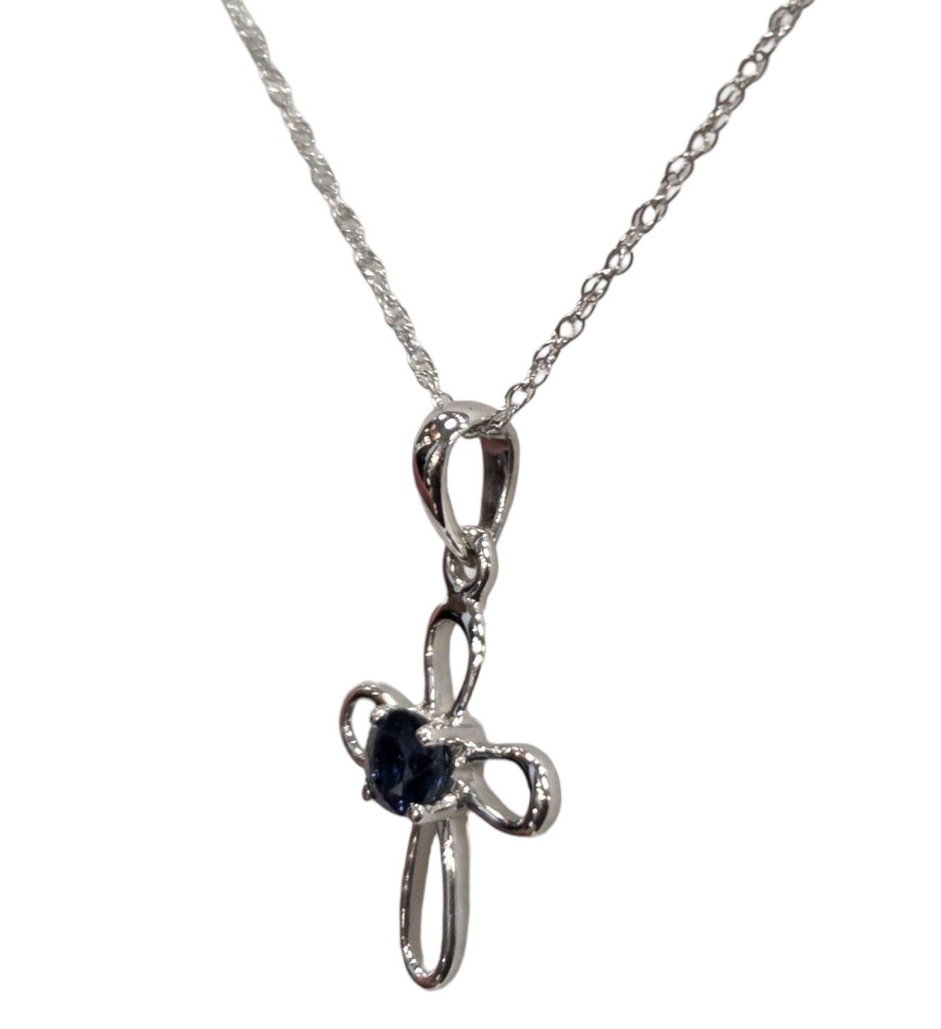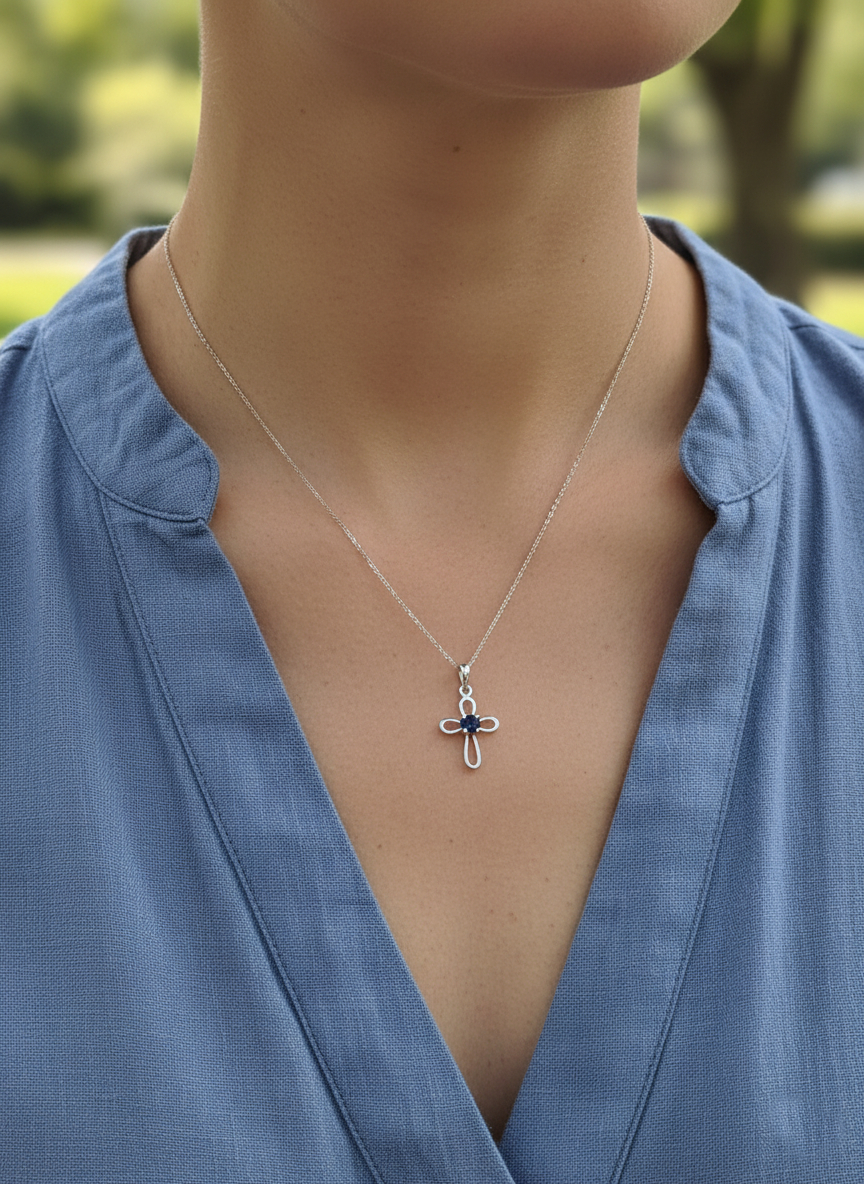 The necklace is 18 inches in length, our most popular length. The sapphire cross pendant measures .75 inches tall (including the bail or loop for chain) by .4 inches wide. Sapphire is also a traditional gift for the 5th and 45th wedding anniversary.