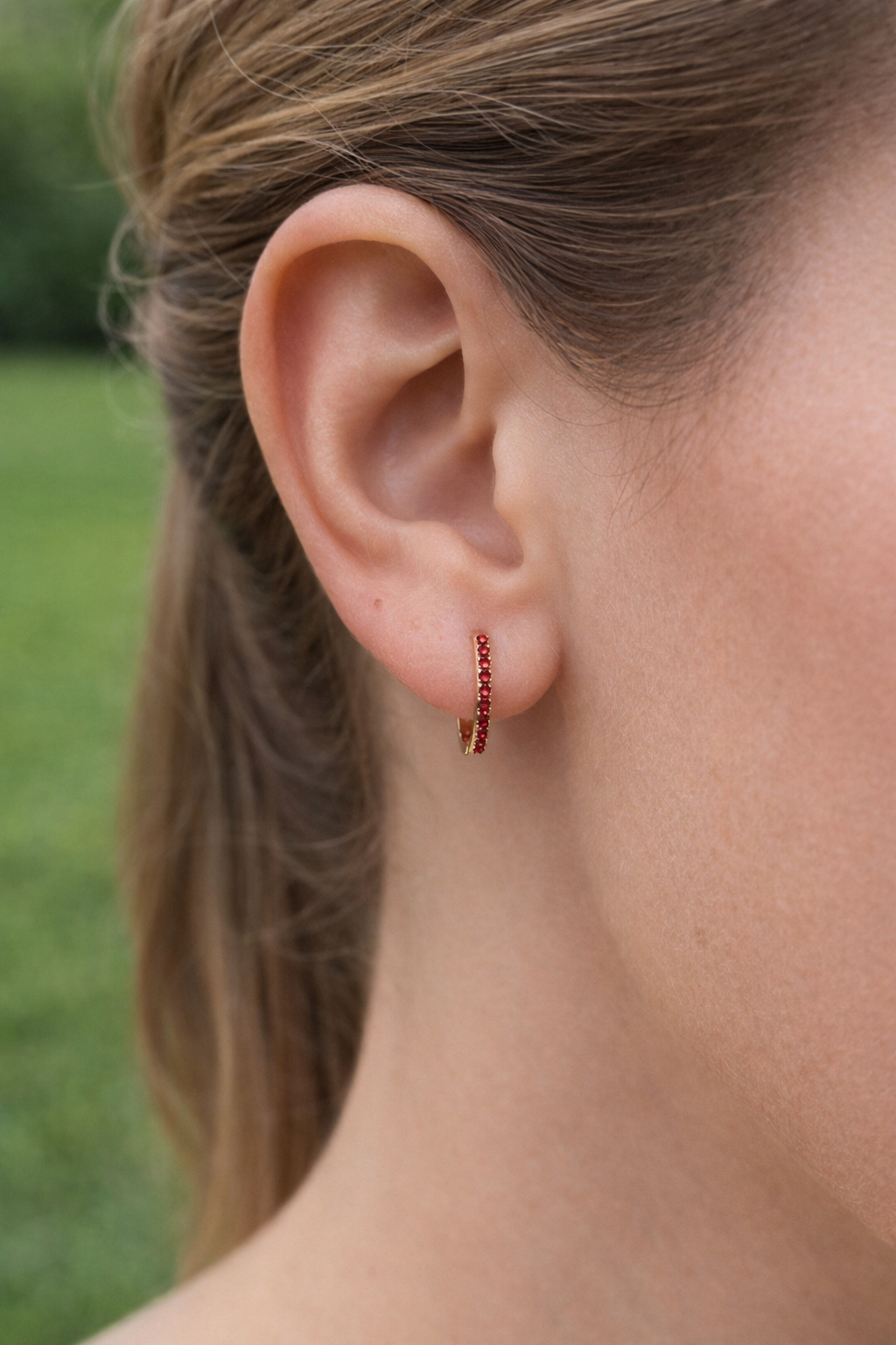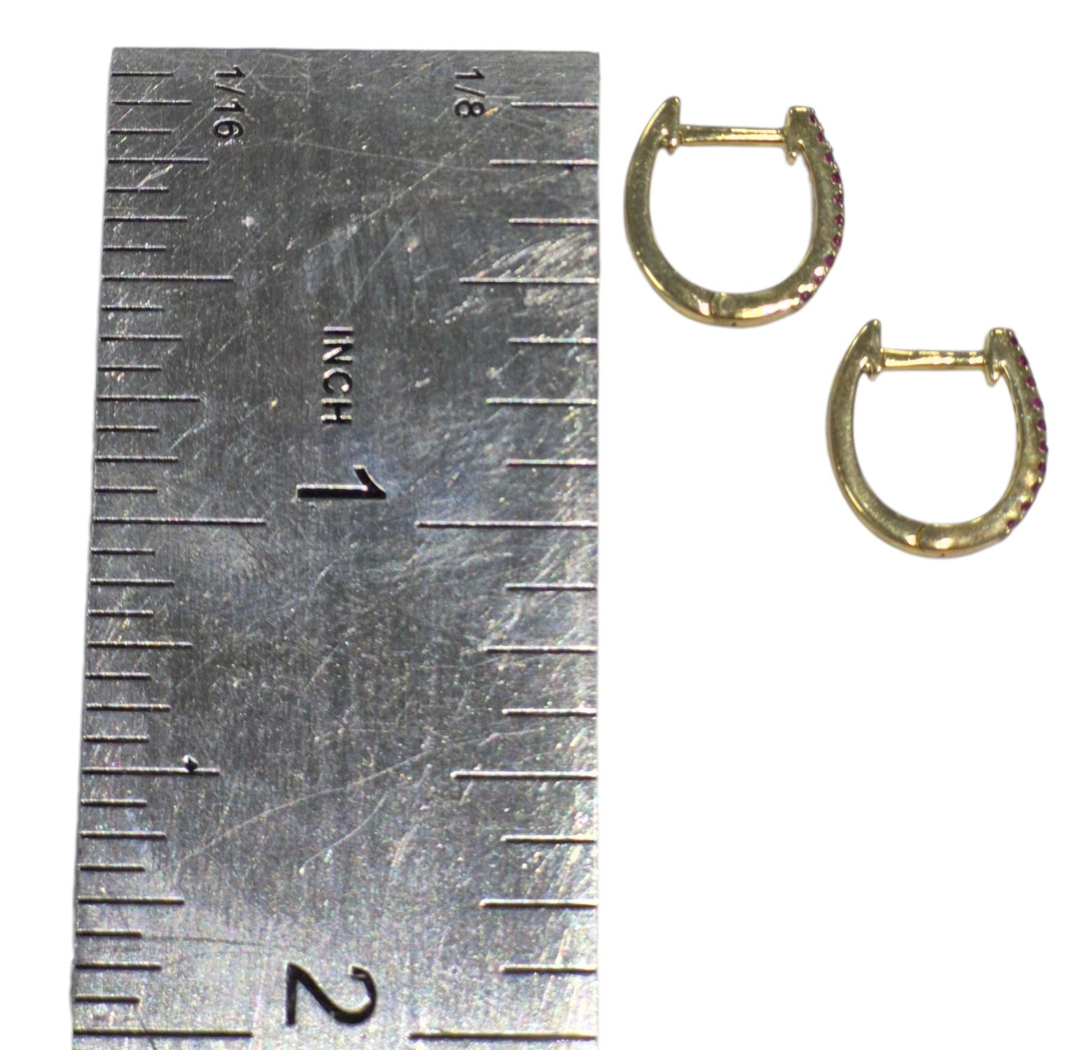 These gold and ruby huggie hoop earrings are a small size measuring approximately 1 MM thick by 12 MM long by 11 MM wide. They fit just around the ear. These earrings click closed, for added security.