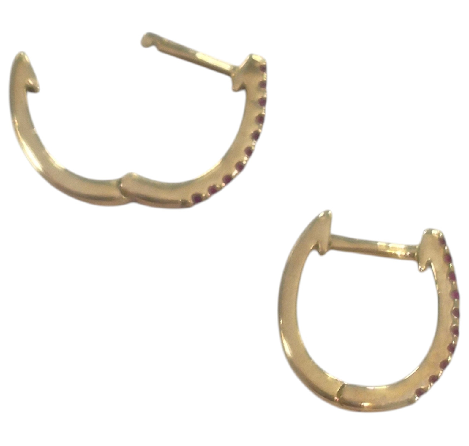 All metal is 10K yellow gold. These earrings feature tiny natural red rubies, totaling .10 CTW on the front of these hoops giving them beautiful sparkle.
