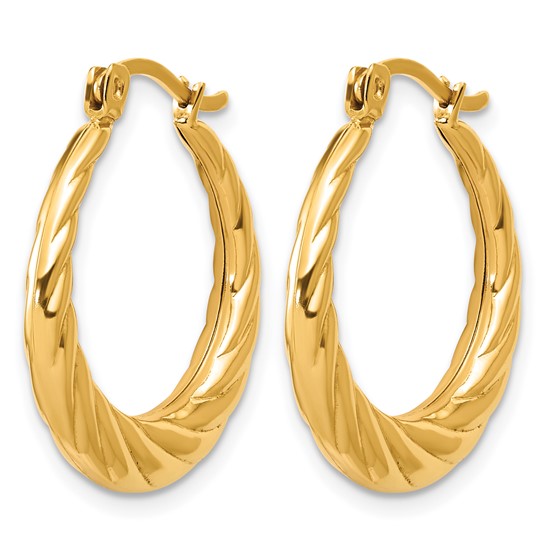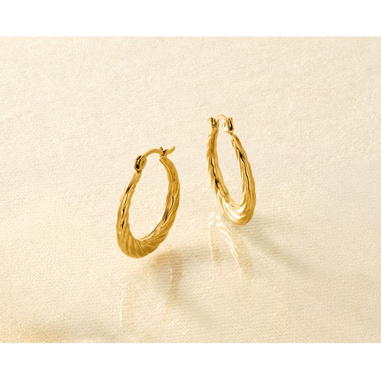 These gold-filled twisted hoop earrings are a great classic design. These hoops measure 20 mm wide by 22 mm long. This gold-filled jewelry features a thick layer of genuine 14K gold over a durable base metal core. This creates a hypo-allergenic metal with lasting strength and bright shine.