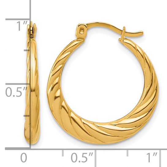These gold-filled twisted hoop earrings are a great classic design. These hoops measure 20 mm wide by 22 mm long. These earrings close with a latch style closure.