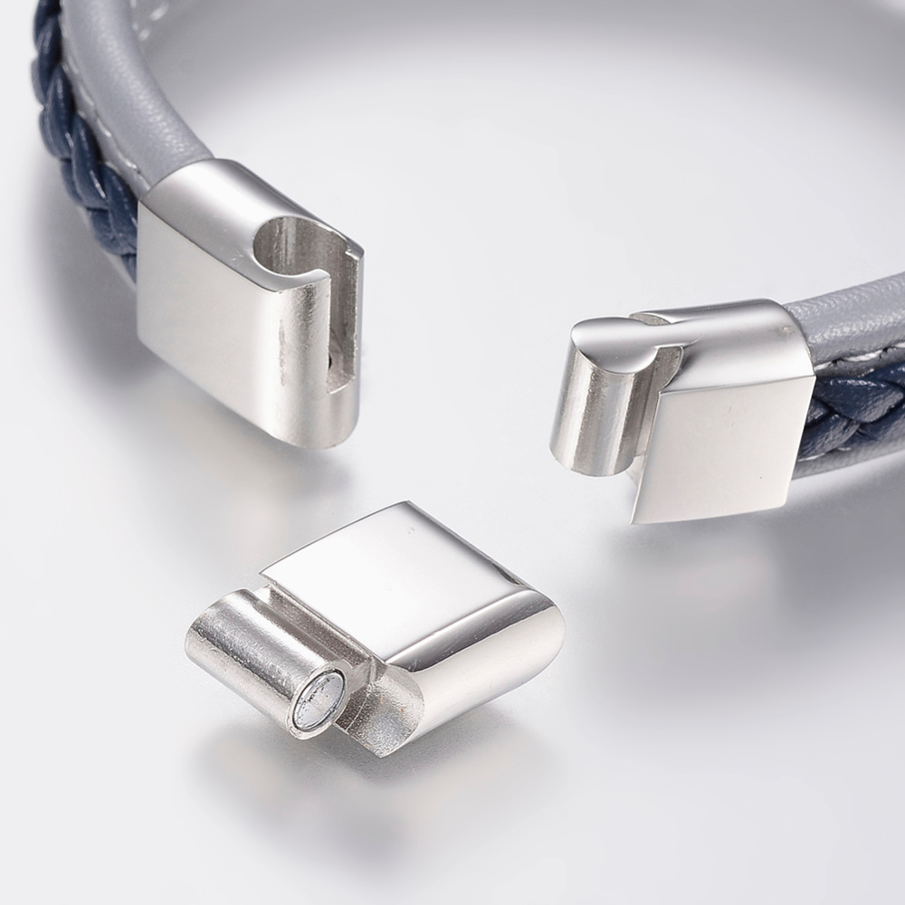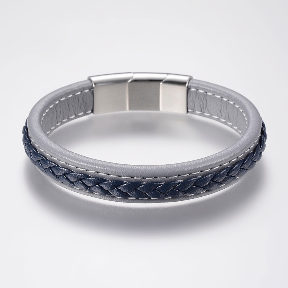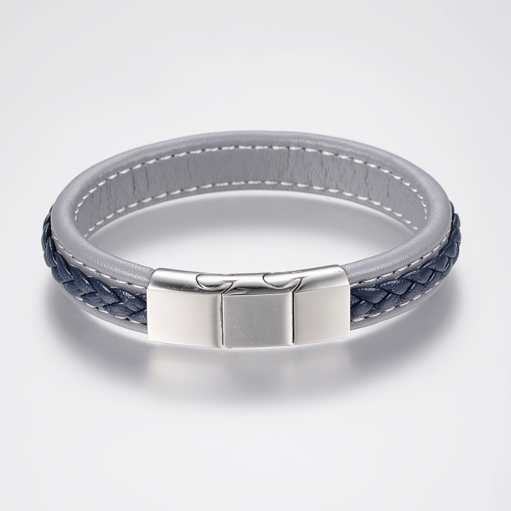 This gray and blue unisex leather bracelet is on trend. It is made from dark blue and light gray leather with a stainless steel clasp. The center is braided blue leather with gray leather edges.