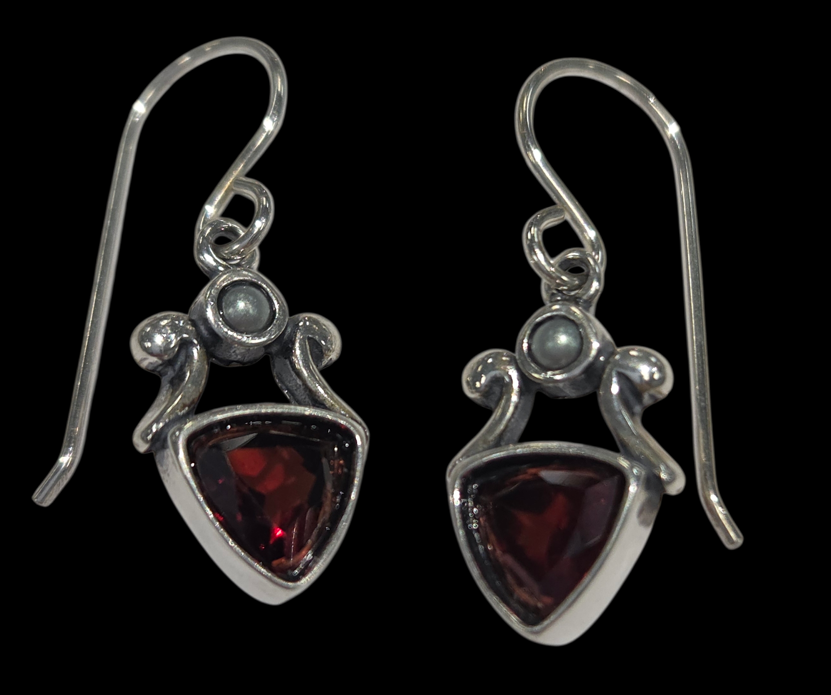 These garnet earrings feature tiny gray fresh water pearl accents. These earrings feature a faceted trillion shape garnet gemstone in each earring. These earrings were designed and crafted by artist Cheryl Sirkus in northern California.