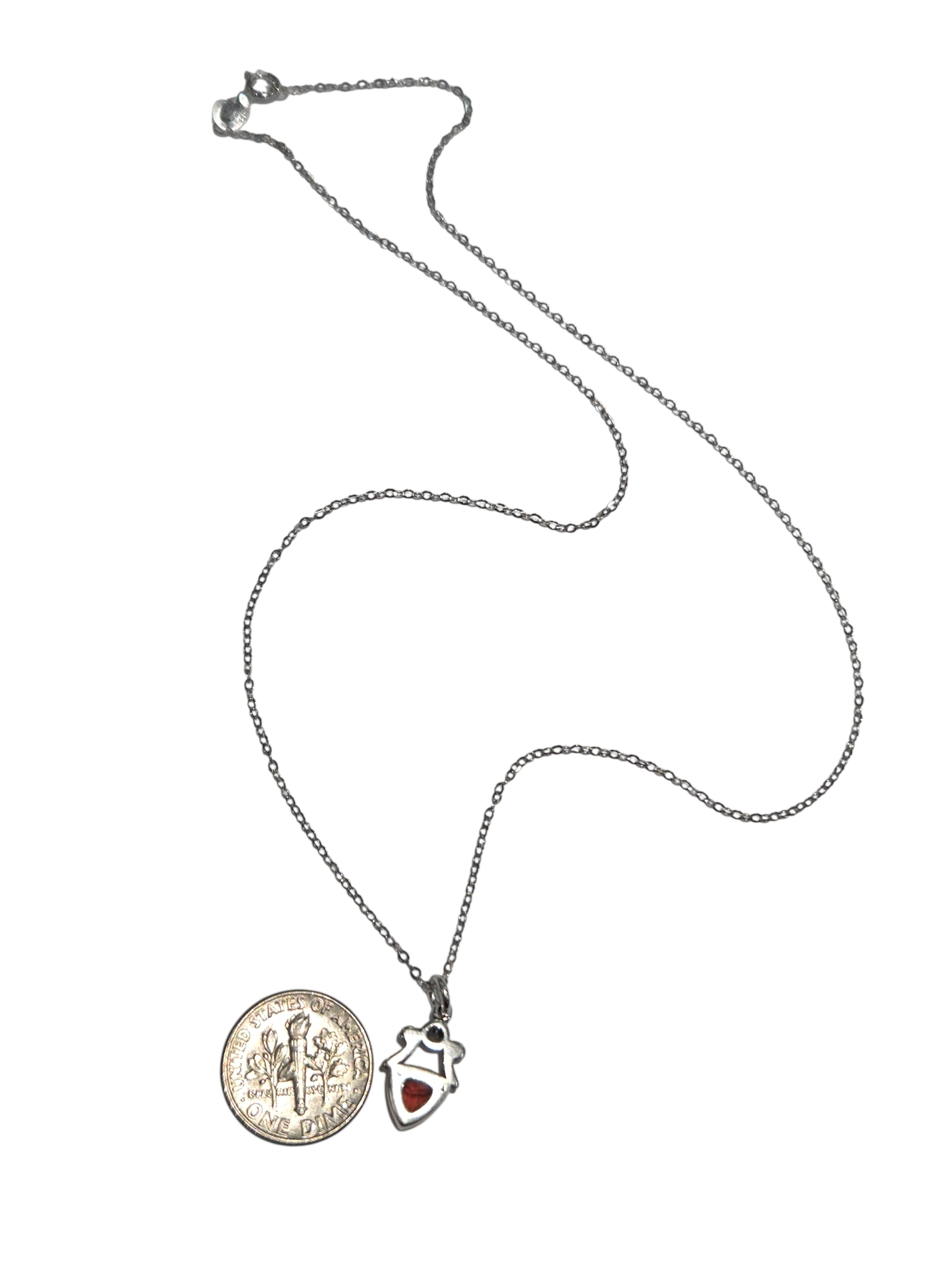 This handmade pendant measures approximately .75″ long (including the bail or loop for the chain) by approximately 0.3” wide. This garnet and pearl pendant comes on an 18 inch sterling silver cable chain. Please note that the dime is not included but is shown to help you gauge the size of the pendant.