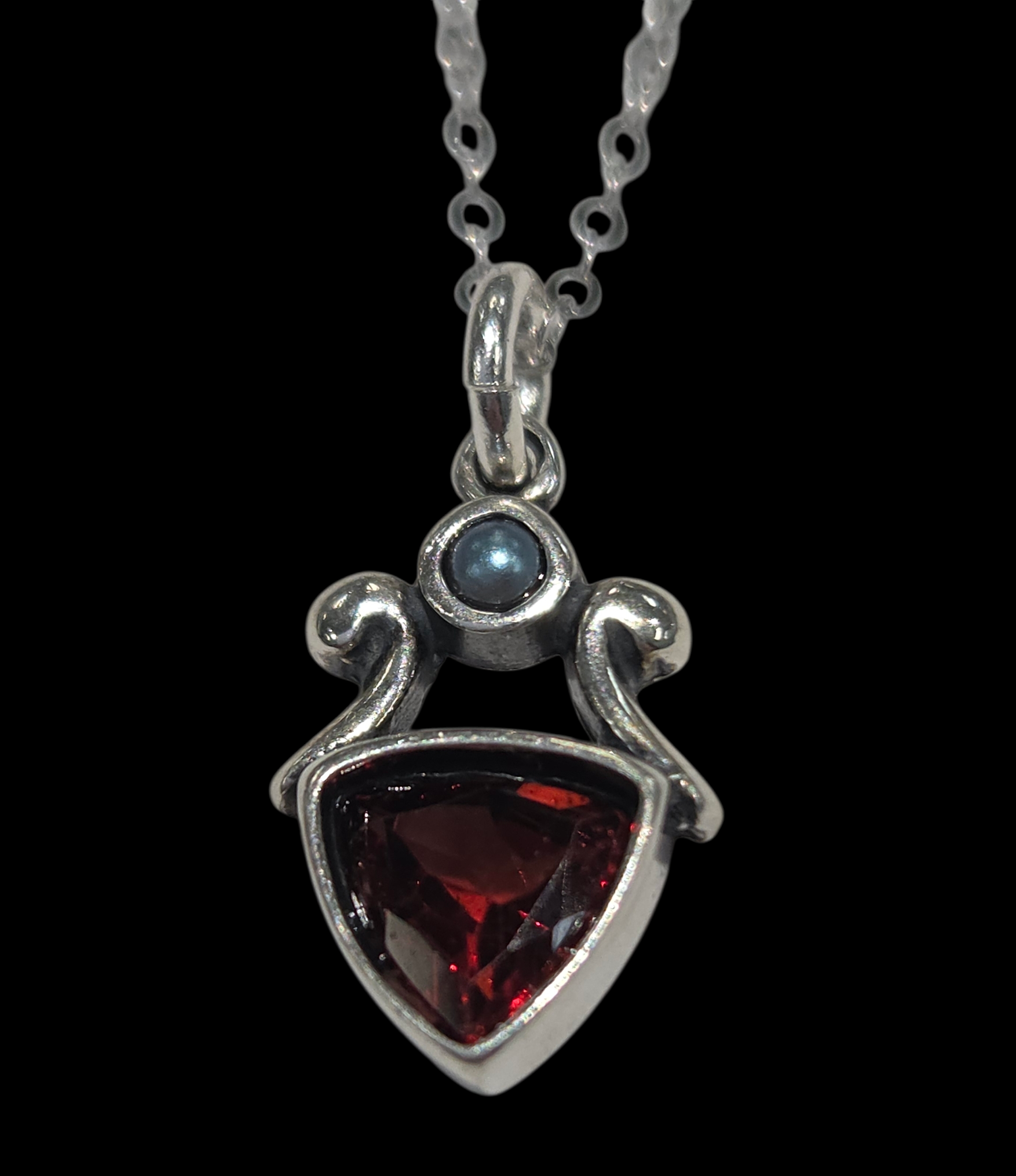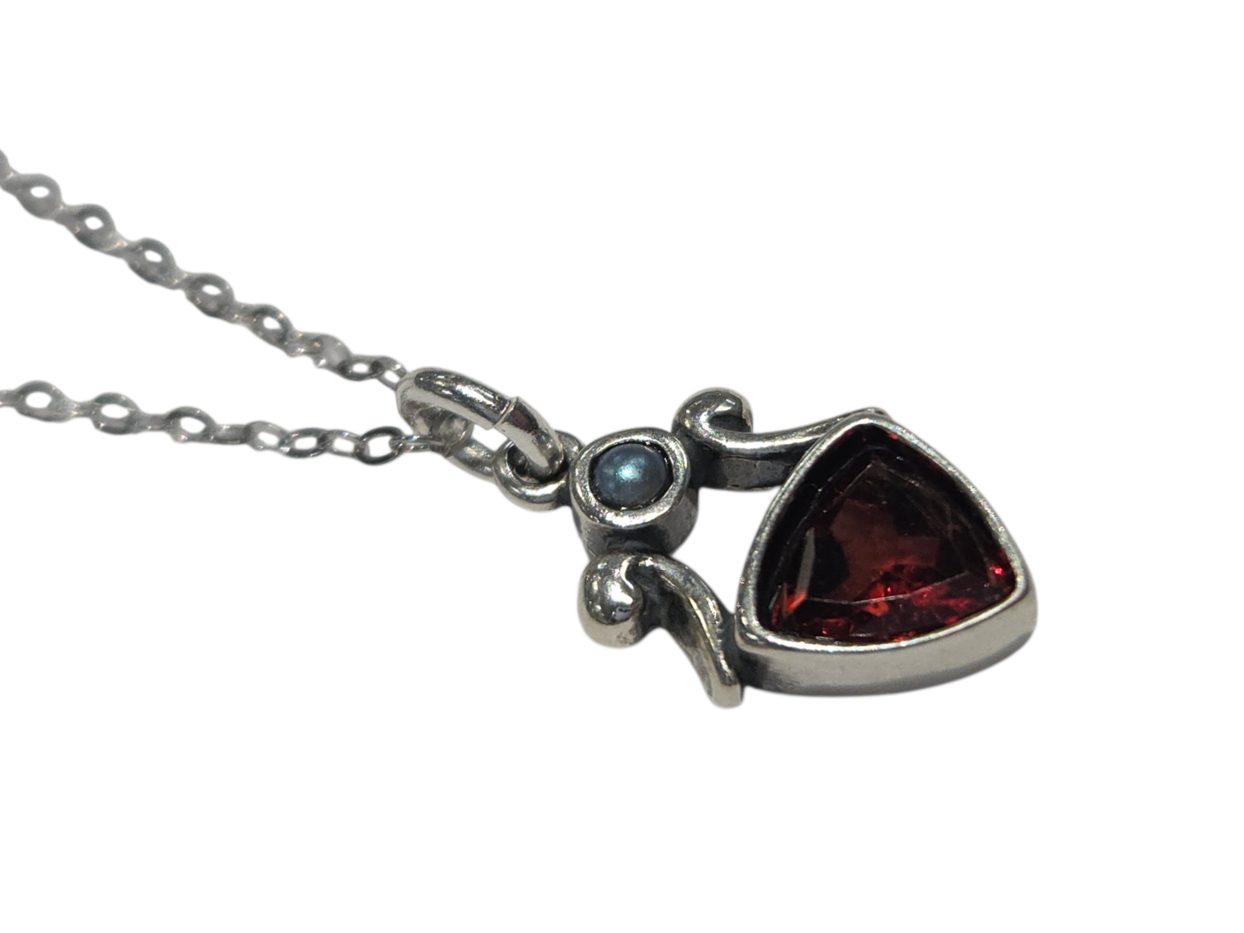 This garnet necklace features a tiny gray fresh water pearl accent. This gemstone necklace features a faceted trillion shape garnet gemstone. This garnet pendant was designed and crafted by artist Cheryl Sirkus in northern California.
