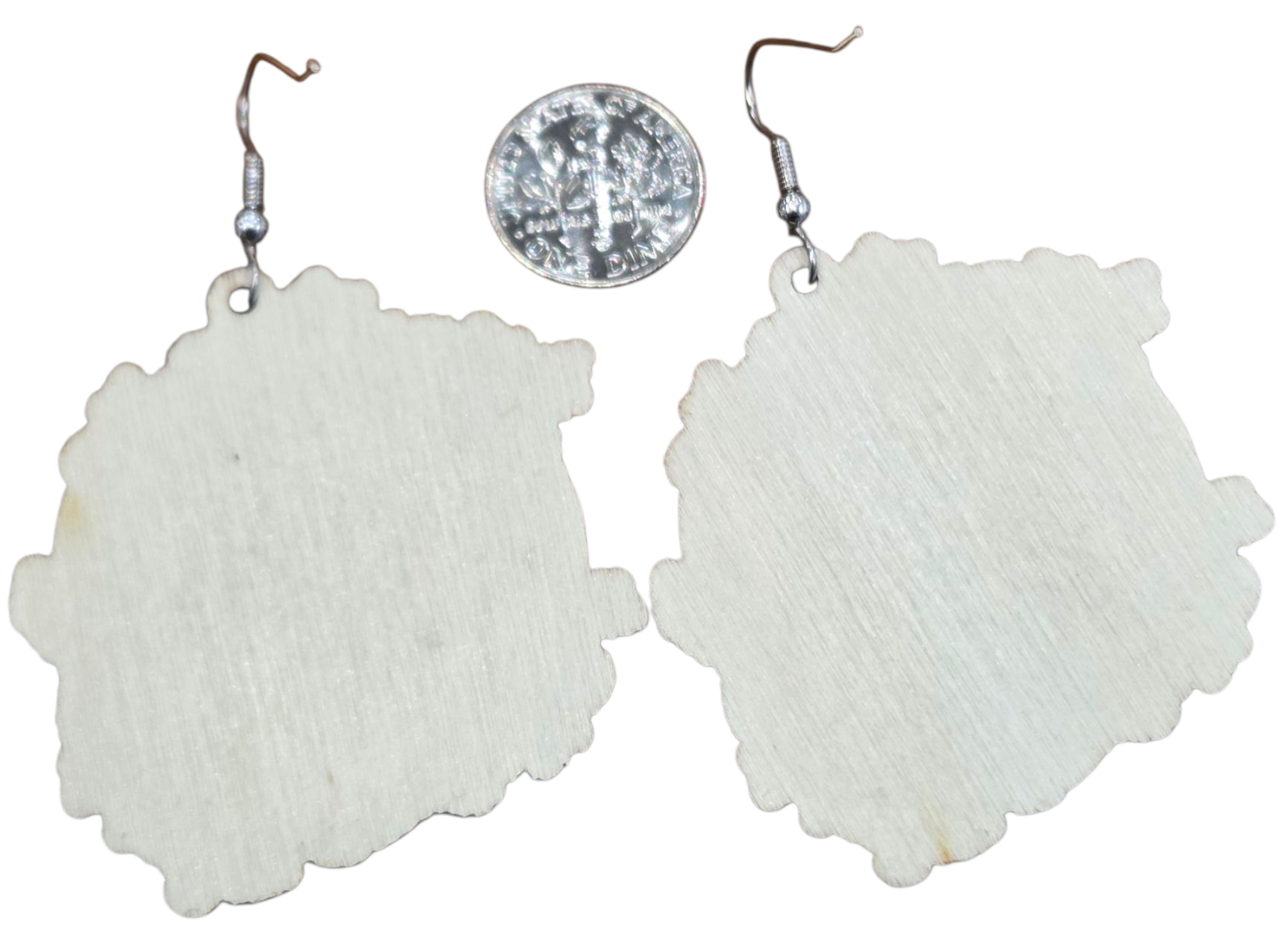 The earrings are large, measuring approximately 2.5 inches tall by 2 inches wide. The earrings are wood, with the image printed on it, making them lightweight despite their large size. Please note the dime in the picture of the backside to help you gauge the size of these earrings.