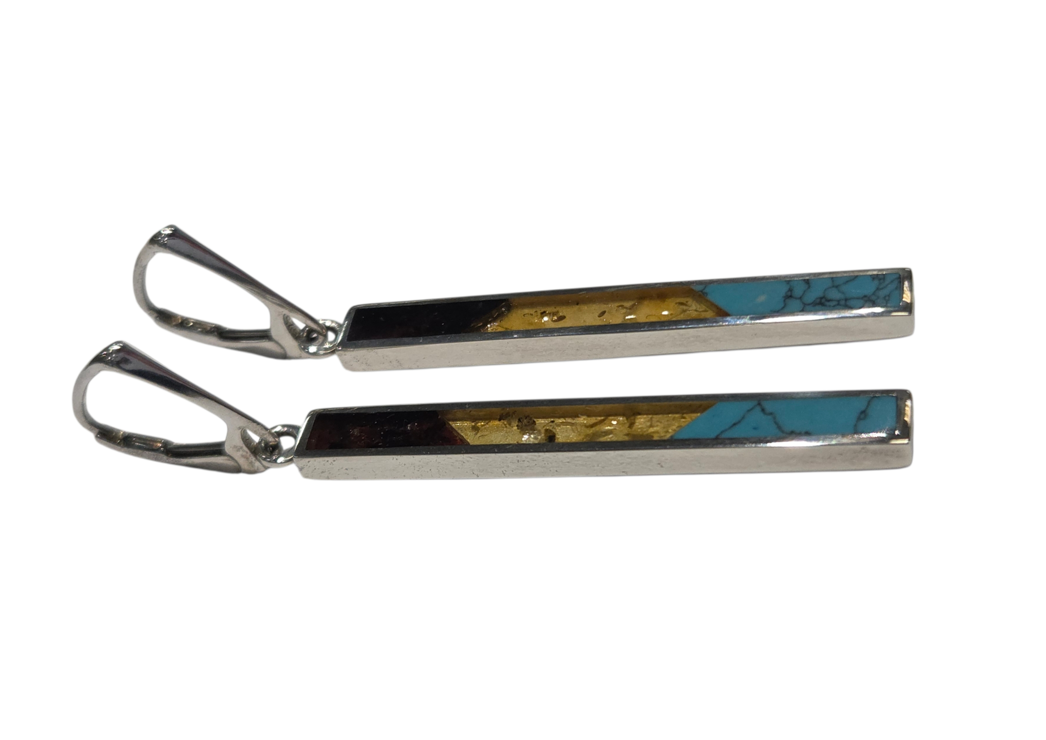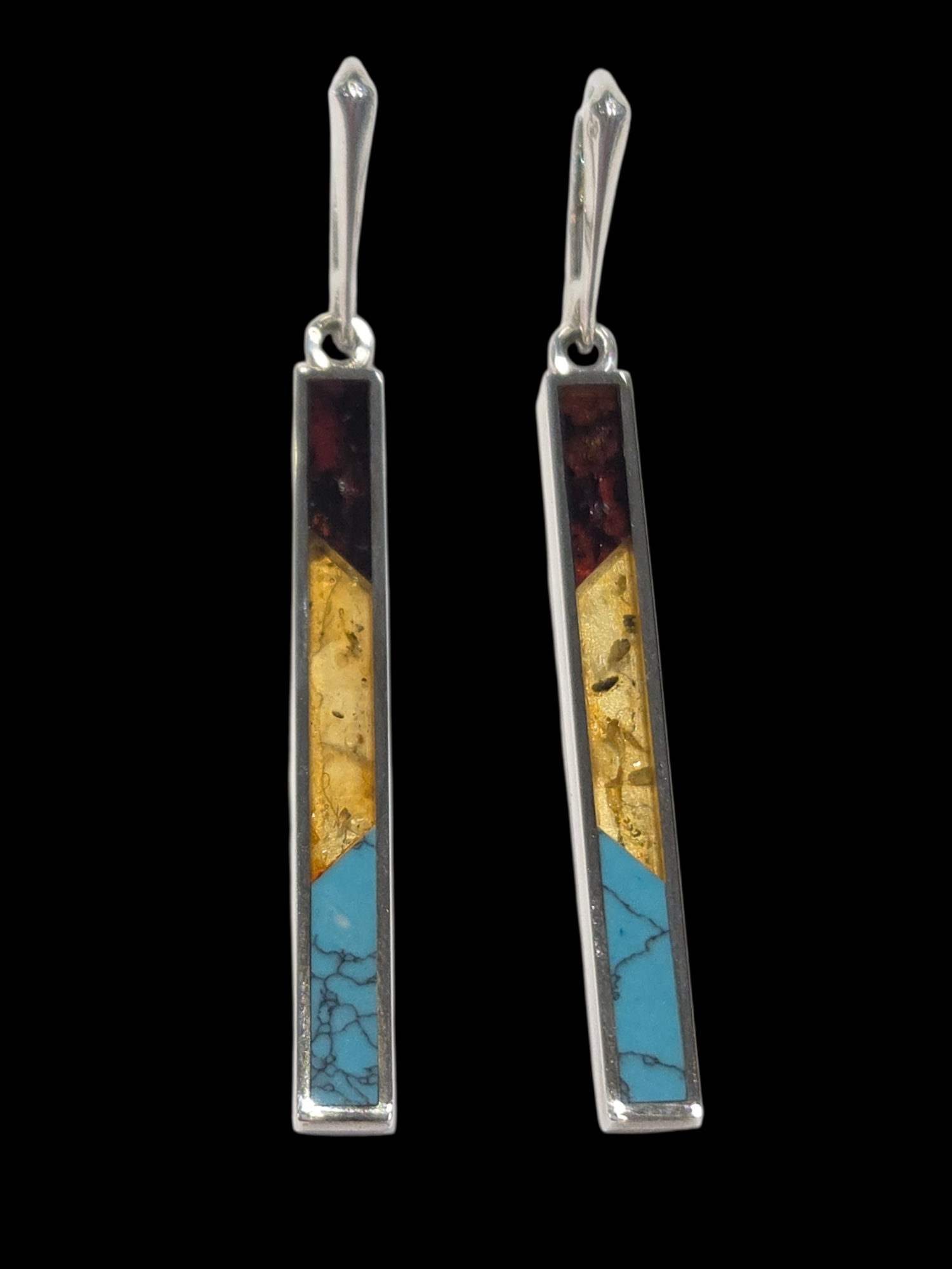 These Baltic amber and turquoise earrings feature both red and yellow amber inlay. All metal used in these earrings is sterling silver. The earrings measure approximately 2.5 inches long (including the ear-wire) by .25 inches wide.