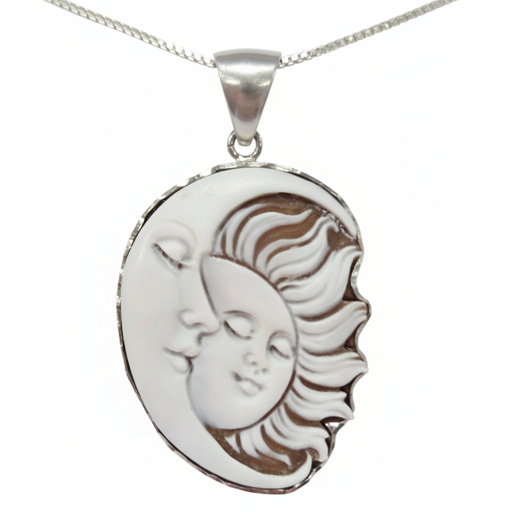 This sun and moon cameo necklace is brand new but has a vintage feel. The cameo is carved from shell and made in Italy. The cameo is very detailed. The cameo depicts a sun and moon, both with detailed faces. All metal is sterling silver. The chain and pendant are stamped 925, which is the international marking for sterling silver.
