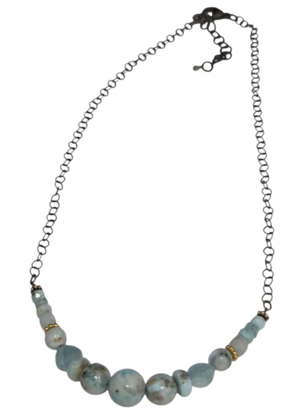 This larimar and aquamarine gemstone necklace features black oxidized sterling silver with 14K gold-fill accents. This two tone mixed metal look is right on trend!This necklace can be adjusted in length from 17 to 19 inches. The necklace is approximately .4 inches wide at the widest point.