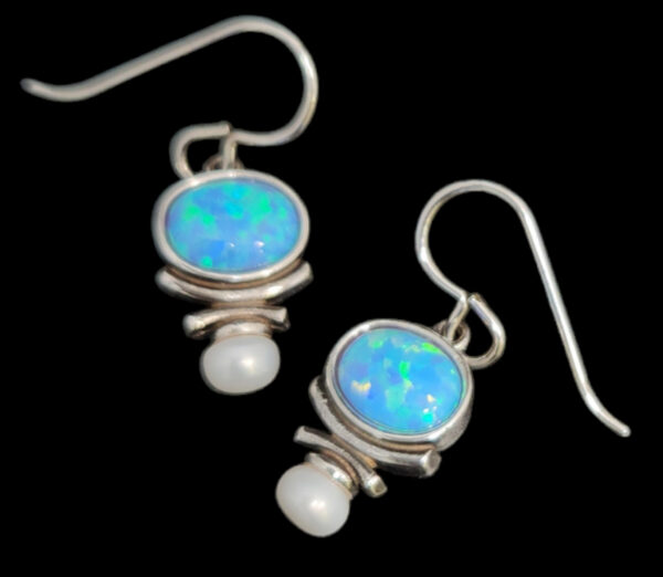 These handmade created light blue opal and pearl earrings are set in .925 sterling silver. These opal earrings measure approximately 1.1″ long (including the ear wire) by approximately 0.45” wide.
