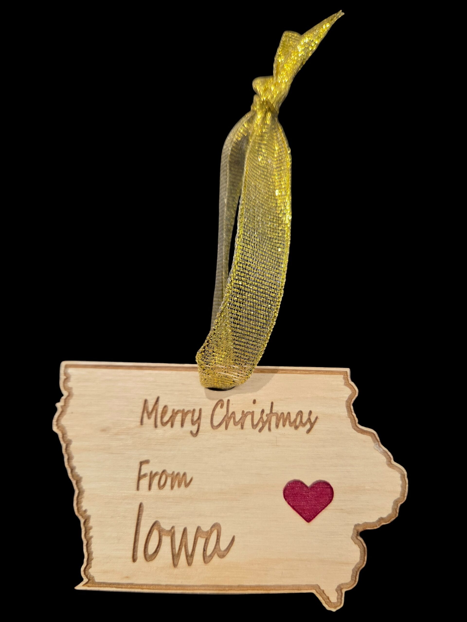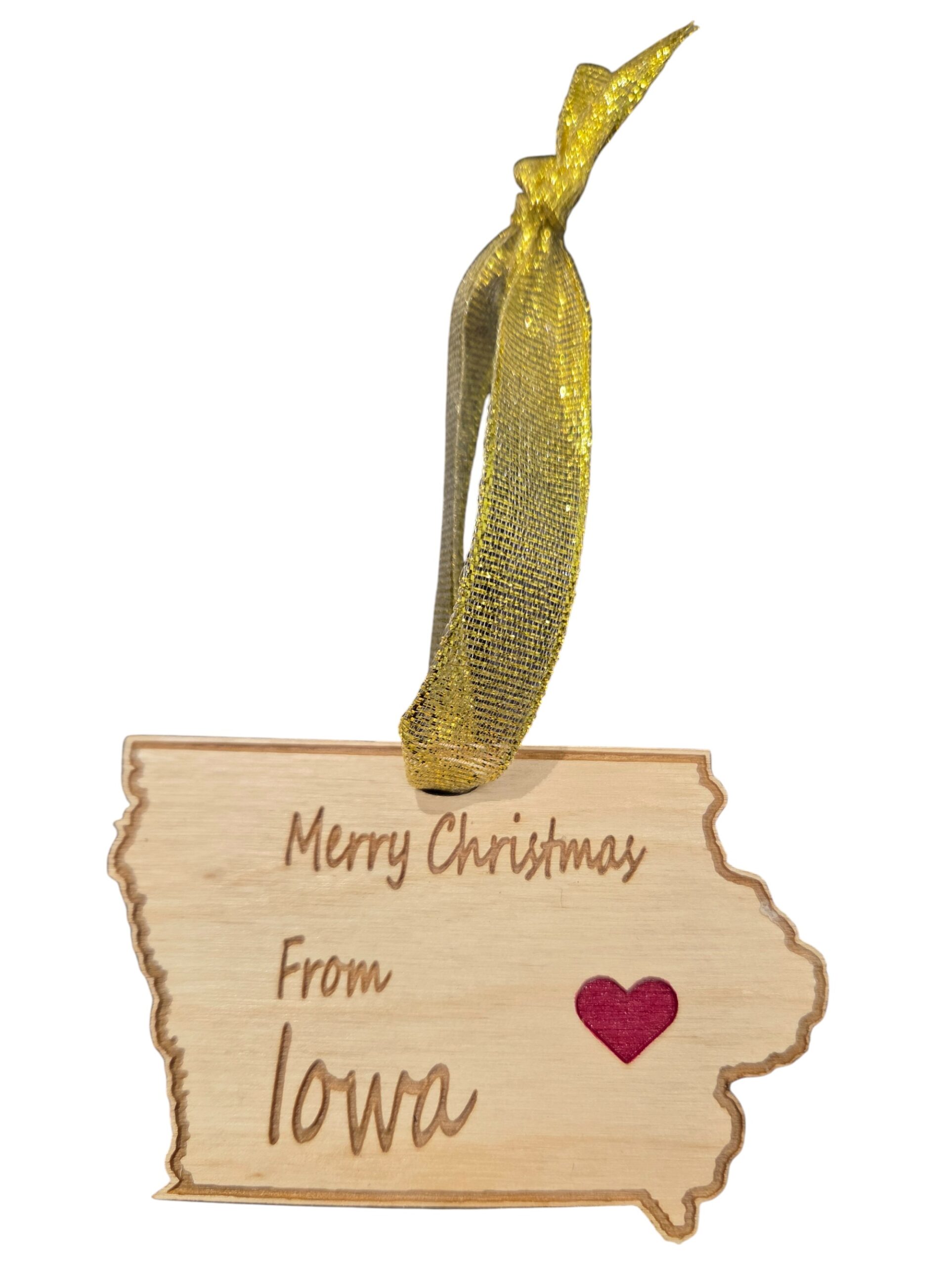 Our Merry Christmas from Iowa ornament is in the shape of the state and has a cute red heart detail.