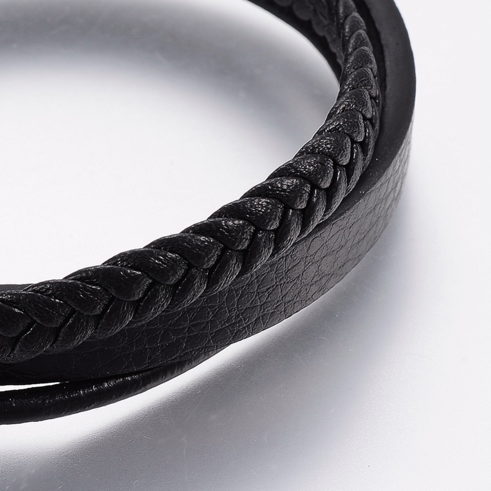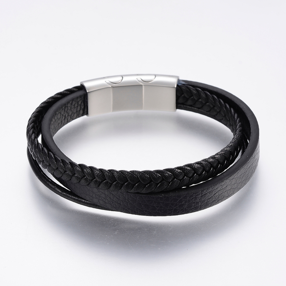This multi-strand unisex black leather bracelet is on trend. It is made from 3 pieces of black leather, including one flat piece, one round piece, and one braided piece.