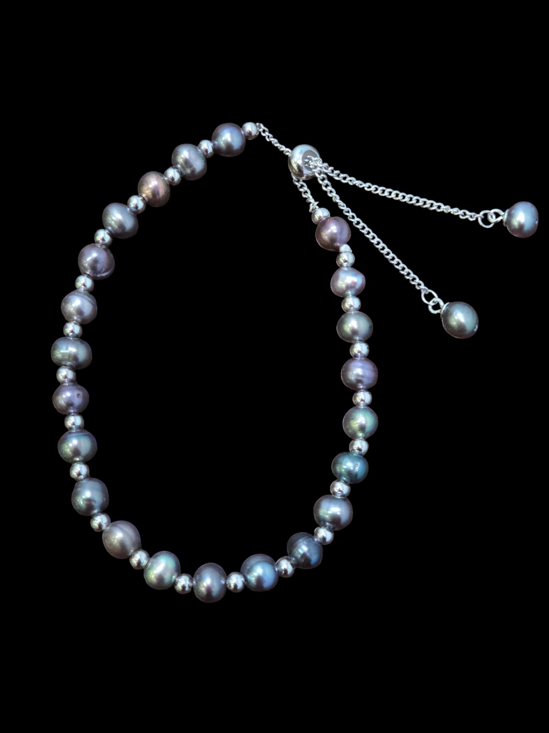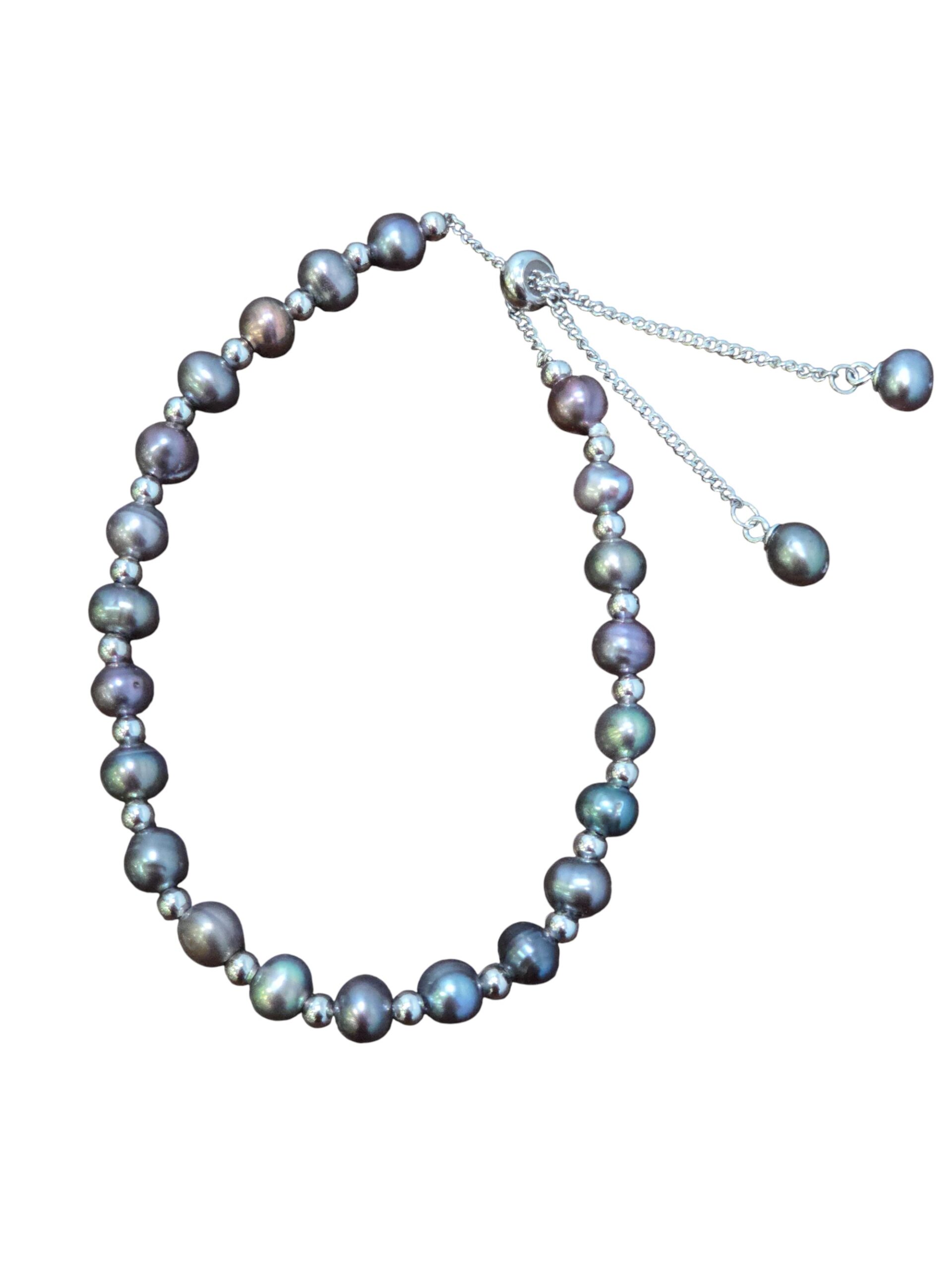 This pearl bracelet has small silver beads between each peacock colored fresh water pearl. The bracelet adjusts with a slider bead to fit most woman. All metal is sterling silver. Peacock colored pearls look mostly gray, but have shades of blue-gray, green-gray, or purple, similar to a peacock feather which they are named after. Each fresh water pearl is approximately 5 MM across, for a petite look.