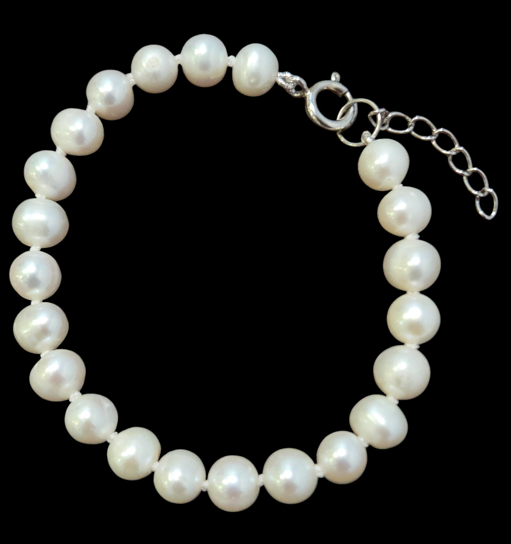 This white pearl bracelet is a very classic jewelry look! The pearls in this bracelet are 7-8 MM white fresh water pearls. The clasp and extender are sterling silver. The bracelet is 7 inches long and extends to 8 inches to fit most woman’s wrists.