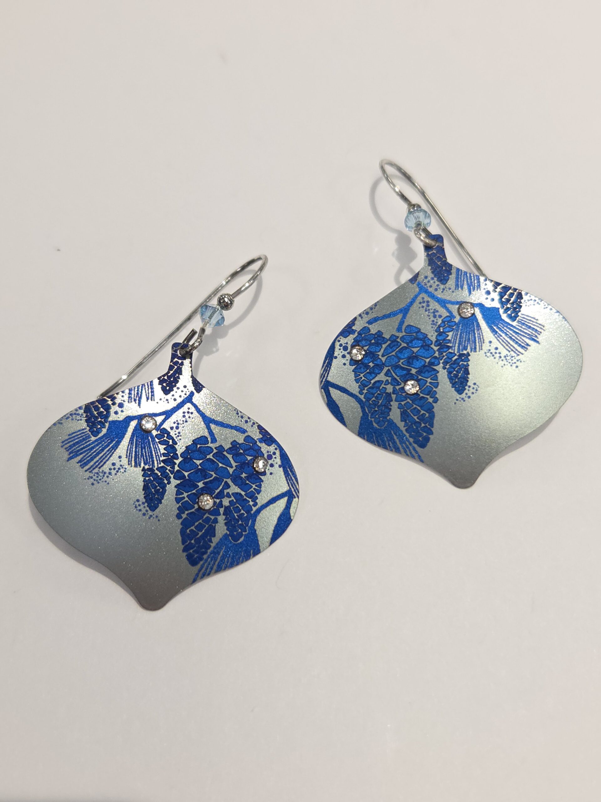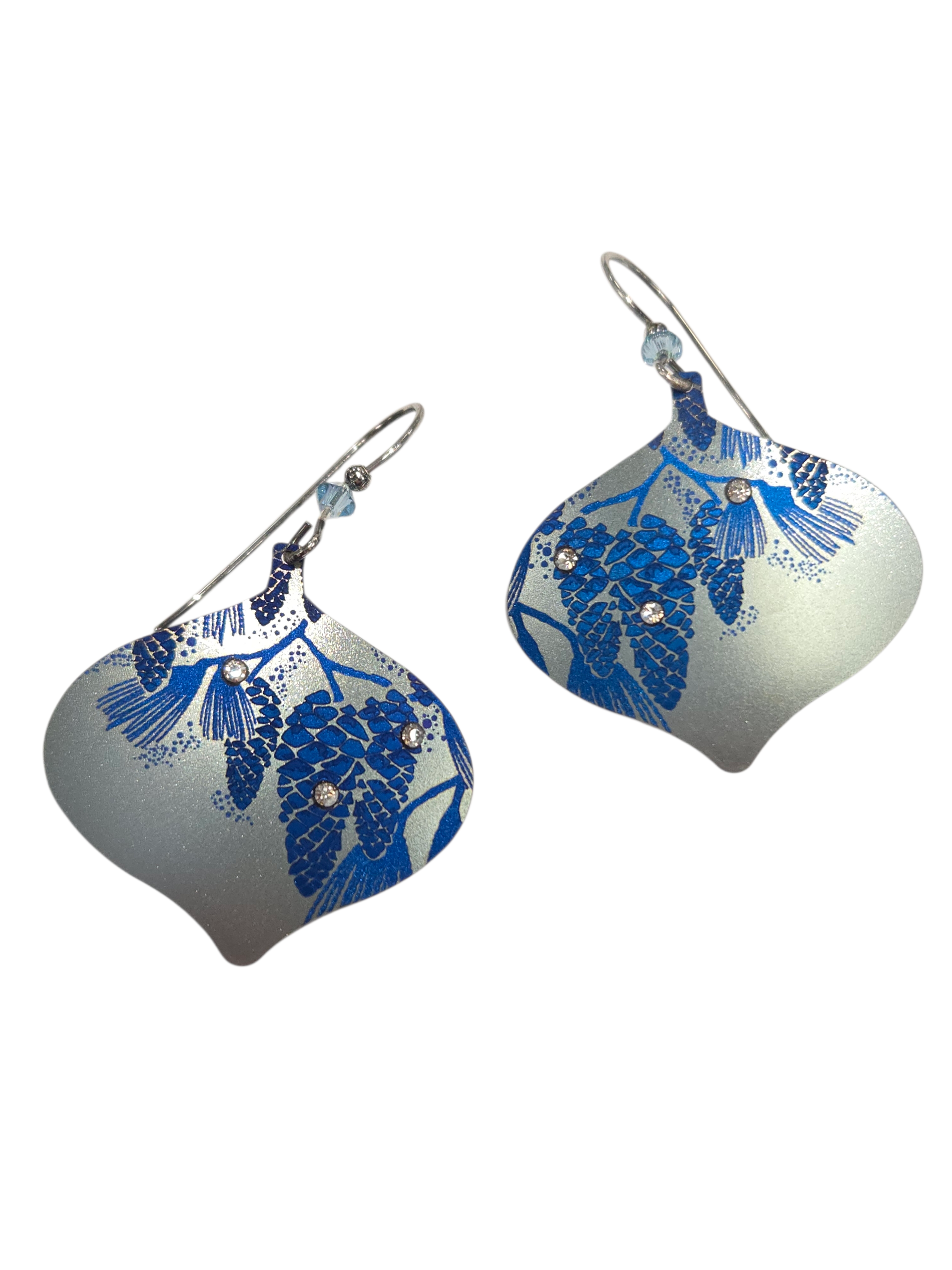 These blue ornament earrings by Holly Yashi have a pinecone design on them. These statement earrings measure 1.75 inches long by 1.75 inches wide. These earrings are niobium that has been anodized blue, with a pinecone pattern. The ear-wires are hypoallergenic sterling silver.