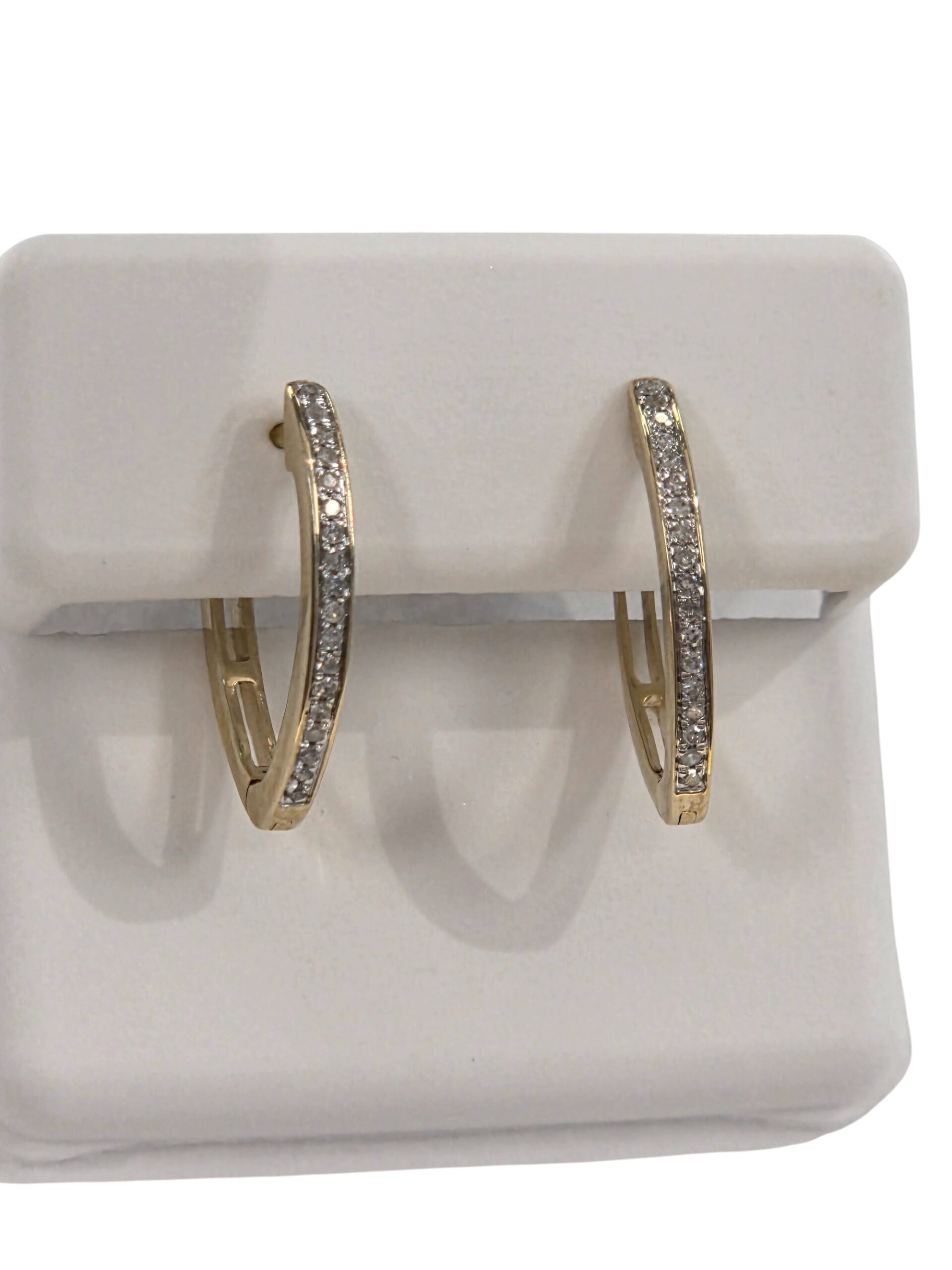 These pointed diamond and gold hoop earrings are a nice size measuring approximately 2 MM thick by 20 MM long by 12 MM wide. They are great for everyday wear, not too large and not too tiny. These earrings click closed, for added security. All metal is 10K yellow gold. These earrings feature tiny diamonds, totaling .10 CTW on the front of these hoops giving them beautiful sparkle.