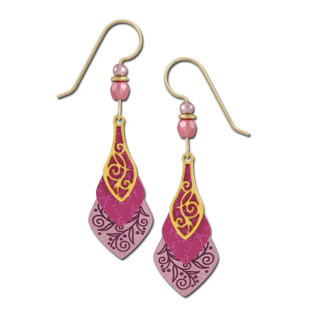 These pink layered earrings have a pointed drop design. The earrings have three layers, one gold-tone cut-out design over a pink layer. The longest layer is a light pink with a pretty vine design..