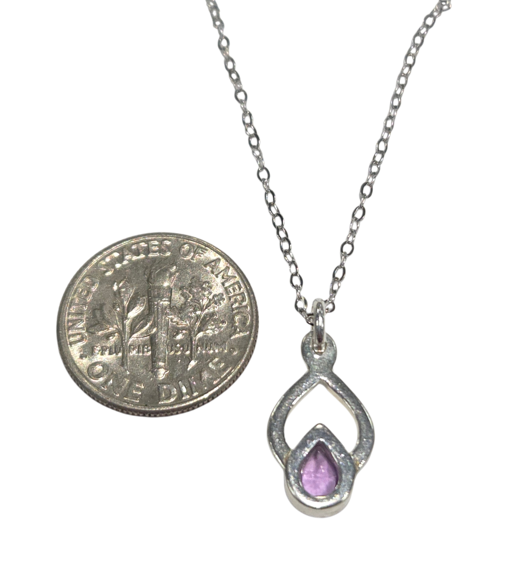 This handmade pendant measures approximately .75″ long (including the bail or loop for the chain) by approximately 0.4” wide. This amethyst pendant comes on an 18 inch sterling silver cable chain. Please note that the dime is not included but is shown to help you gauge the size of the pendant.