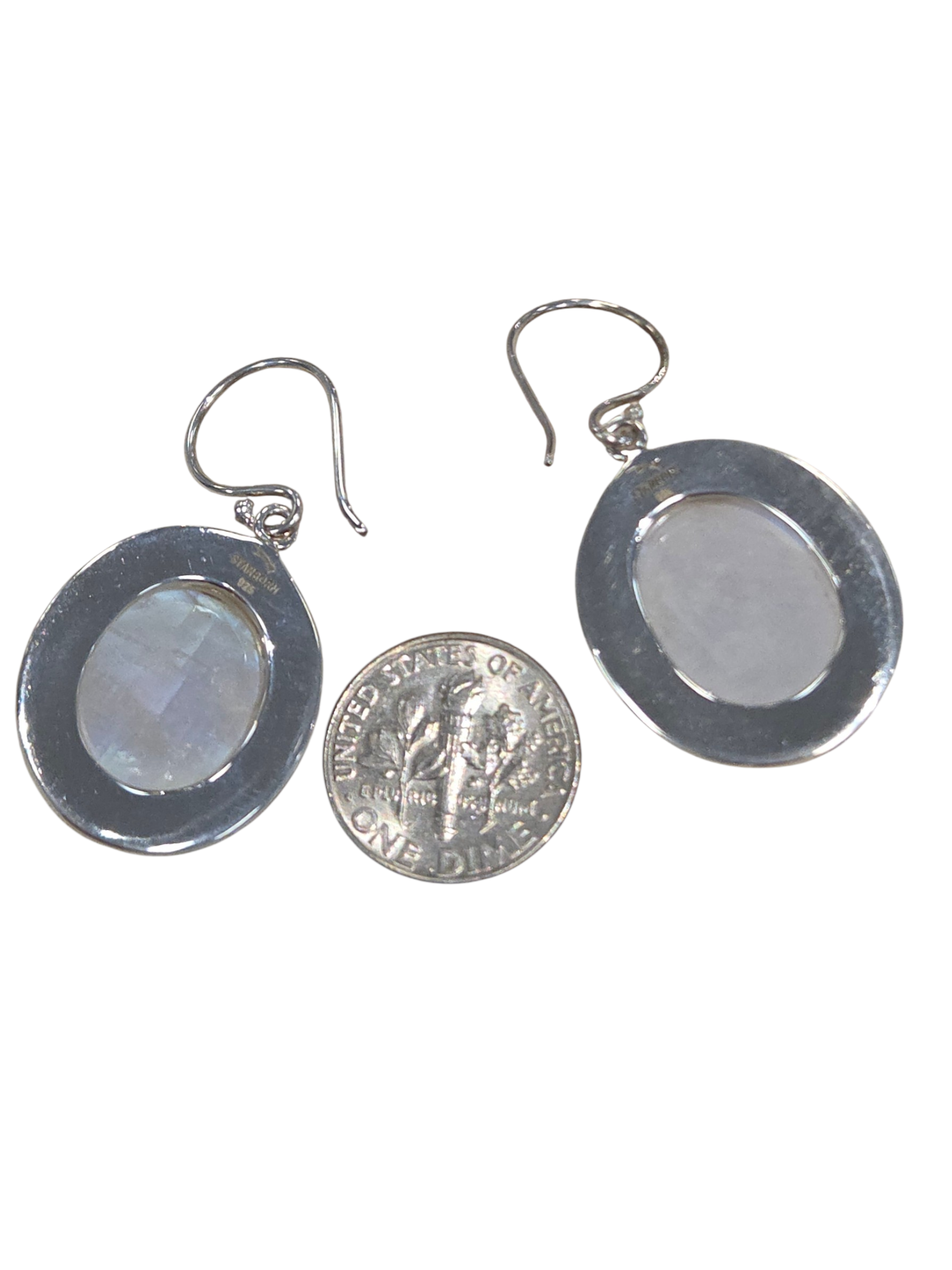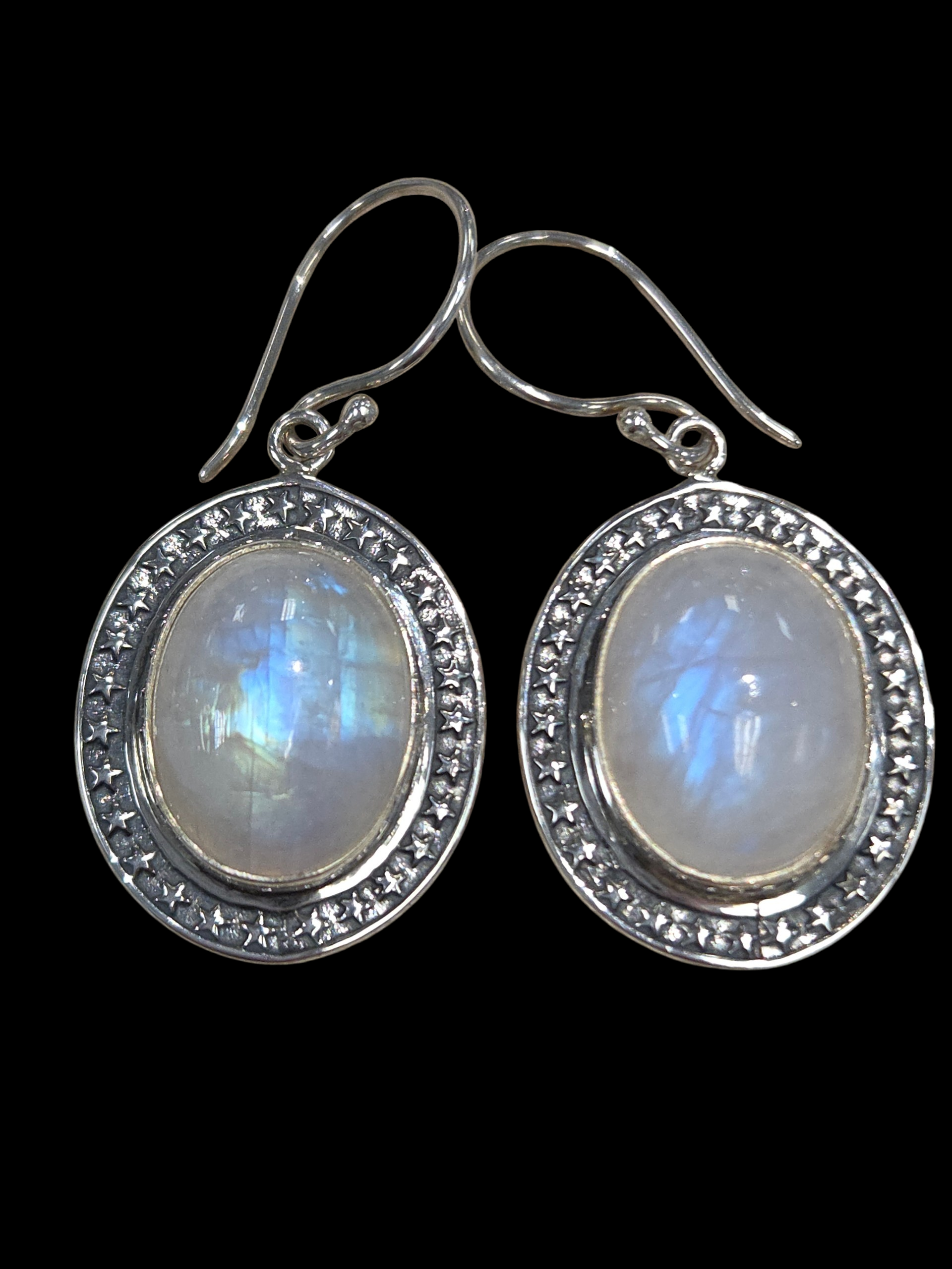 These star and rainbow moonstone earrings have tiny repeating star pattern around the gemstone. All metal is sterling silver. These earrings measure approximately 1.55 inches long (including the ear-wire) by .76 inches wide.