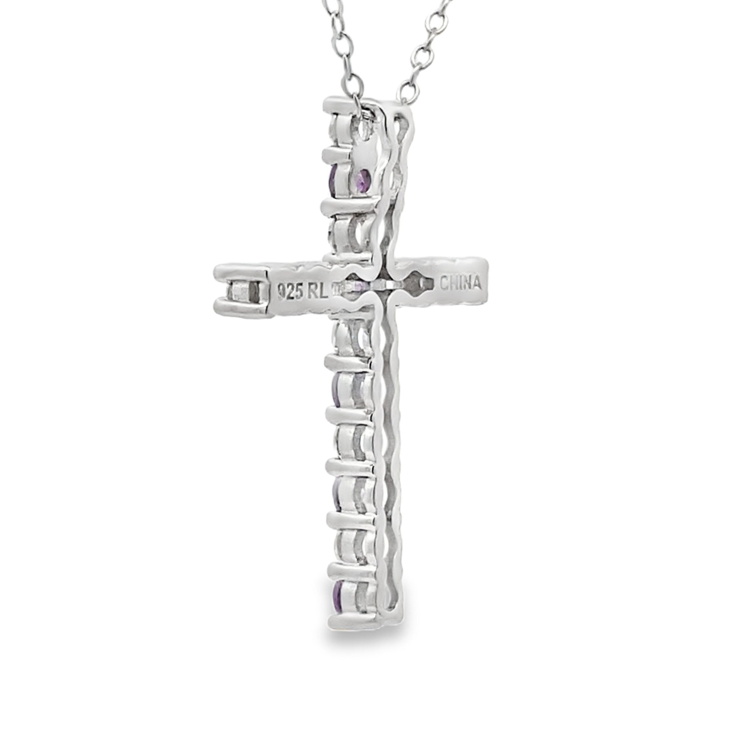 This amethyst cross necklace is a classic style. It features natural purple amethyst gemstones with created white sapphires. All metal in this necklace is sterling silver.