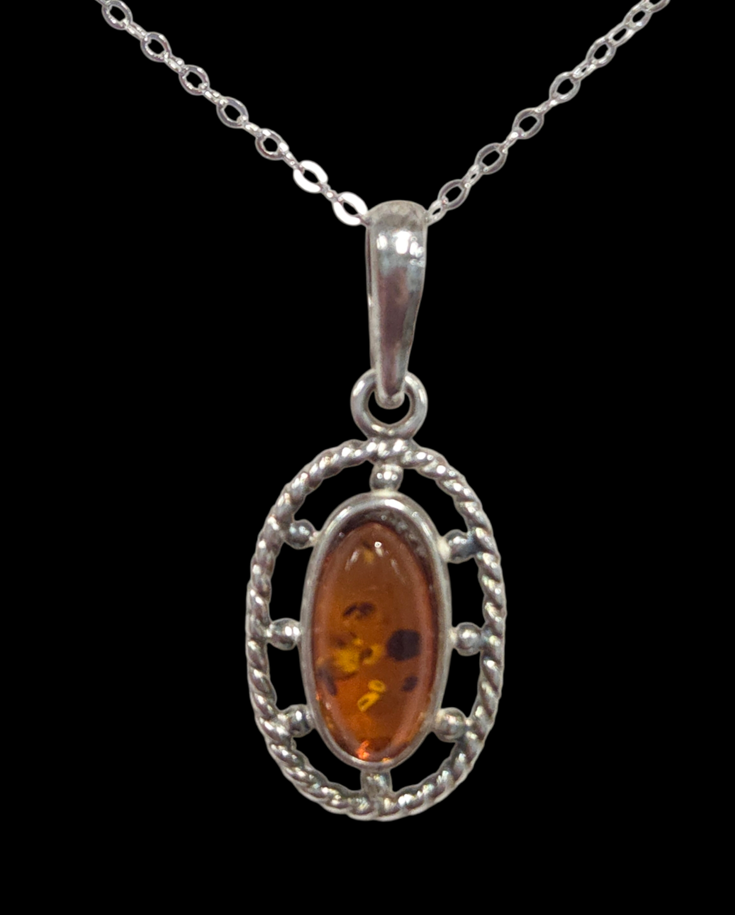 This sterling silver and Baltic amber oval necklace has pretty detailed silverwork. All metal is sterling silver.