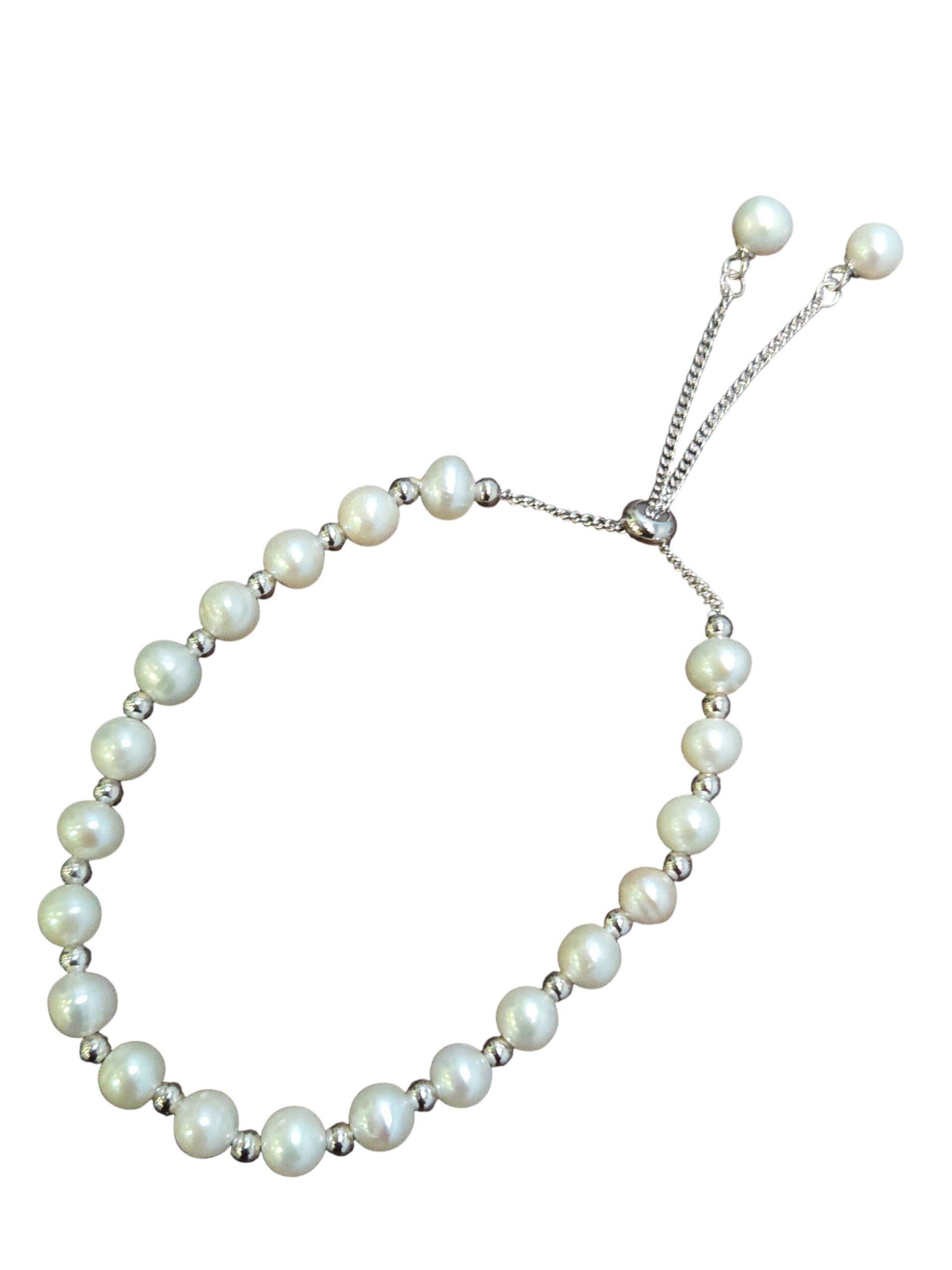 This pearl bracelet has small silver beads between each white fresh water pearl. The bracelet adjusts with a slider bead to fit most woman. All metal is sterling silver. Each fresh water pearl is approximately 5 MM across, for a petite look.