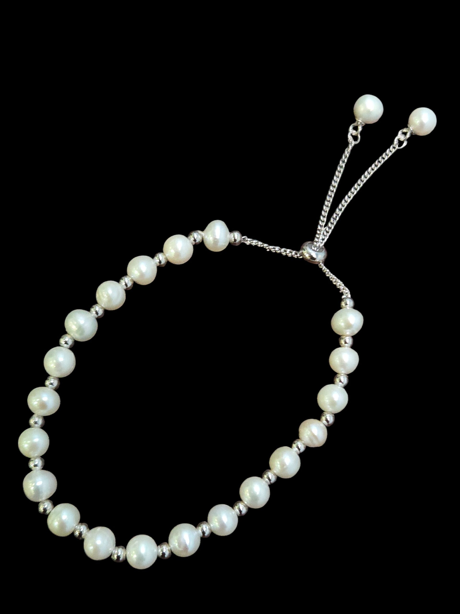 This pearl bracelet has small silver beads between each white fresh water pearl. The bracelet adjusts with a slider bead to fit most woman. Slide the silver bead down, to make the bracelet larger and easy to slip on. Than slide the silver bead up, to adjust to fit. All metal is sterling silver.