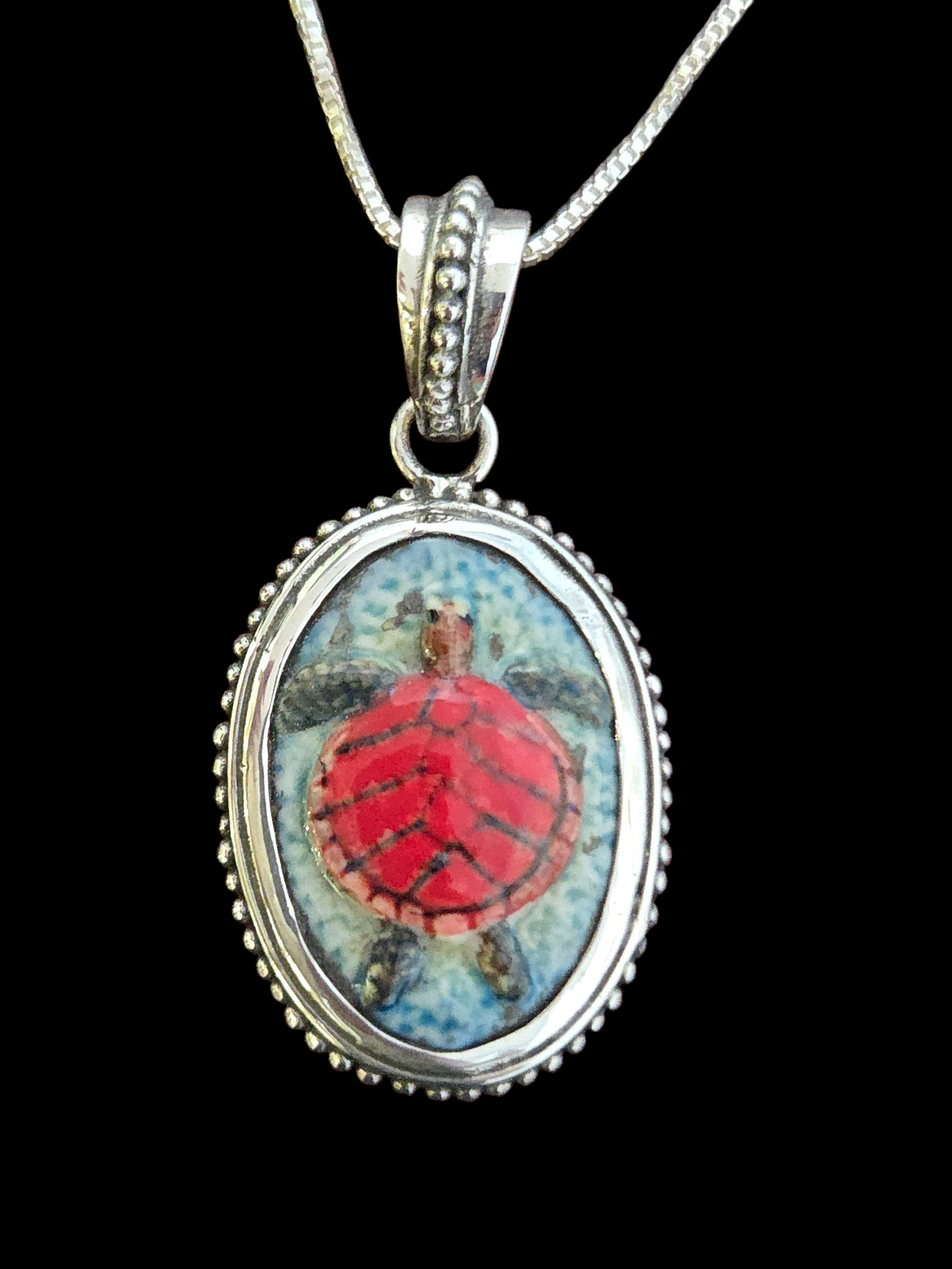 This sterling silver colorful sea turtle necklace is great for an animal lover. The colorful turtle is made from ceramic. The sea turtle has a red shell with a green body and is swimming in blue water. The pendant measures approximately 1.8 inches (including the bail or loop for pendant) long by .9 inches wide.