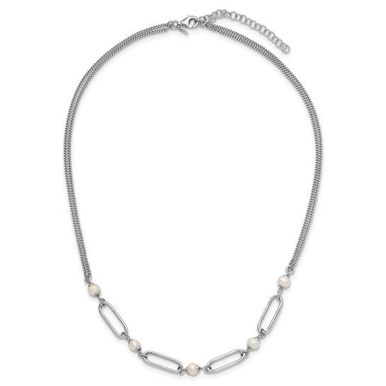 This sterling silver large link pearl necklace features five white fresh water pearls between large silver links. The white fresh water pearls are approximately 6 mm each. This necklace has a large link chain at the back that allows the necklace to be adjusted in length from 16 and 18 inches.