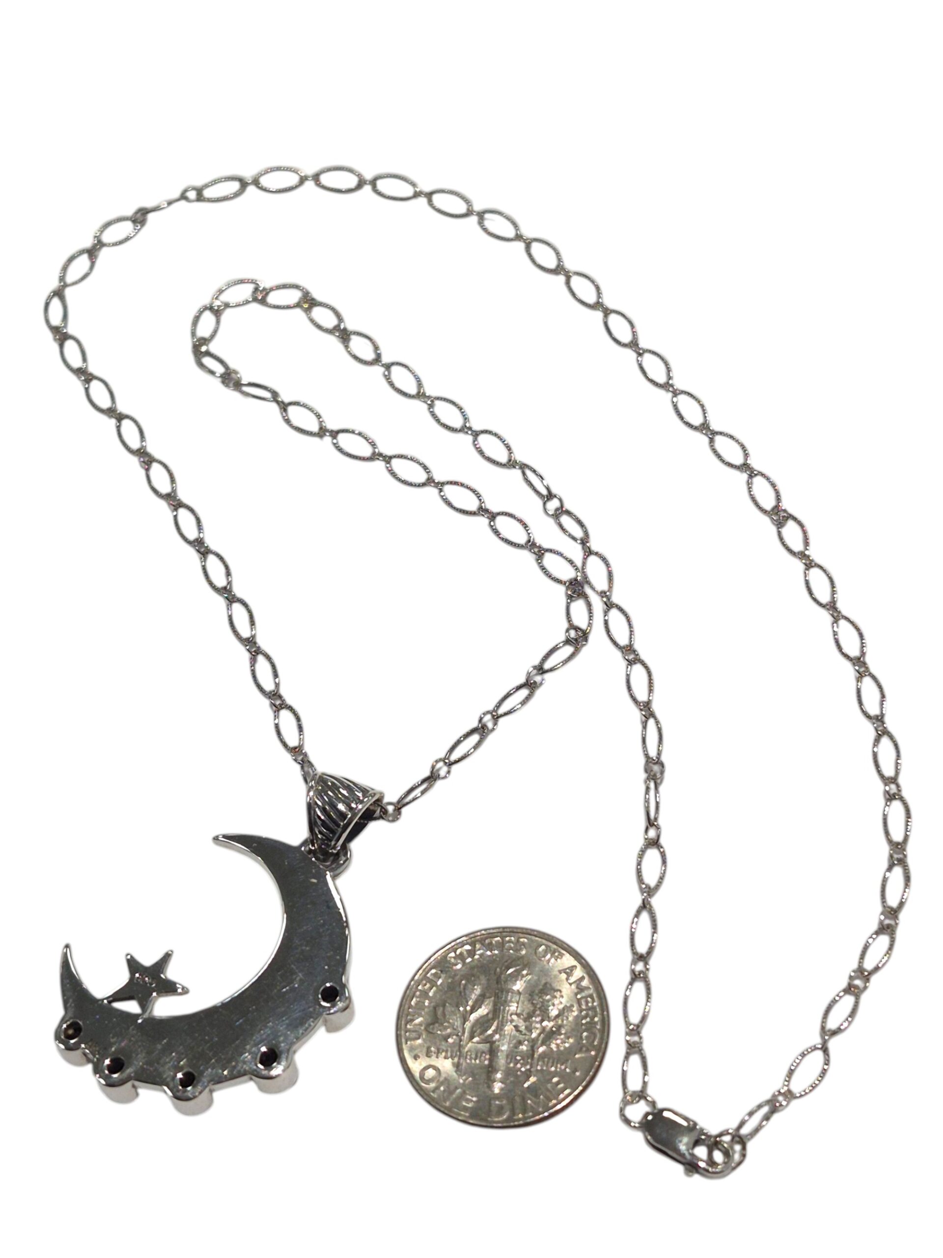 The necklace is stamped on the back 925 so you can rest assured it is sterling silver. The sterling silver chain is 18 inches in length, but can be clasped in any of the large ovals if you want to wear the necklace shorter. The moon pendant measures 1.25 inches long by 1 inch wide.