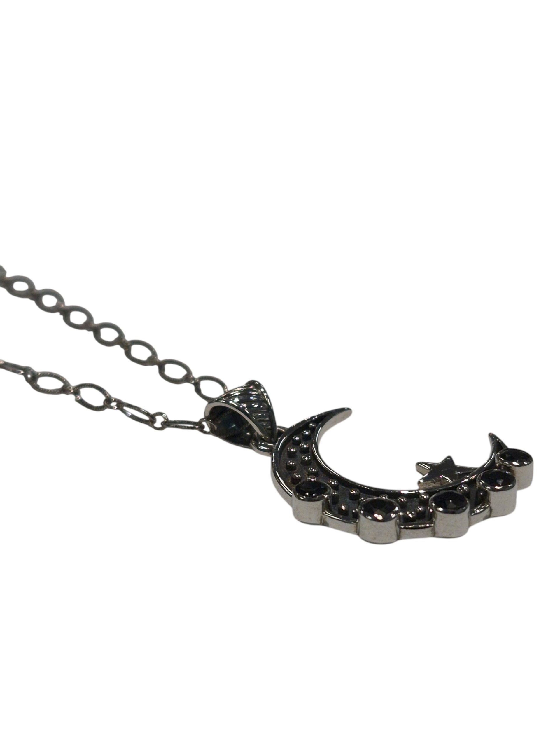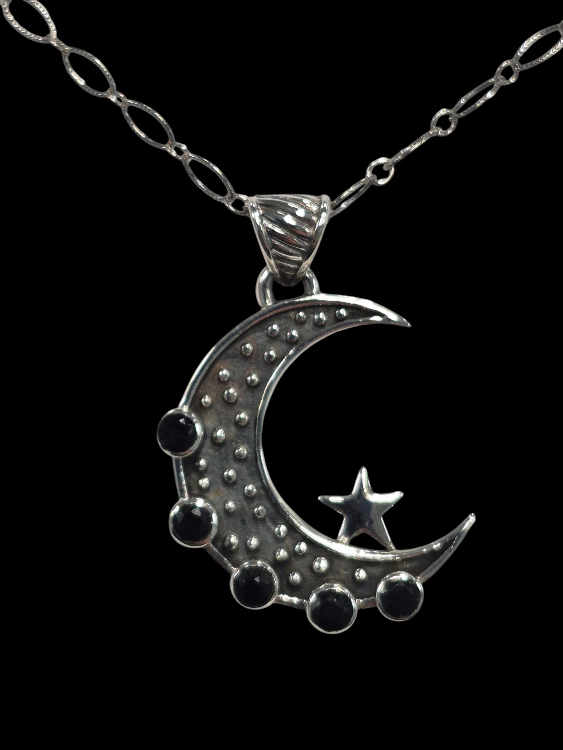 This sterling silver necklace is oxidized so that the moon has dark gray almost black detail. All stones are black onyx. There is a shiny silver star that sits on the moon.