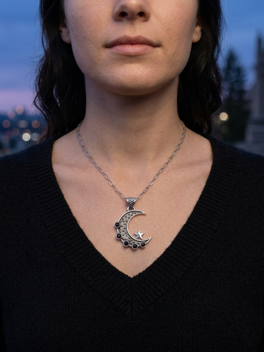Sterling Silver Moon Necklace with Black Onyx