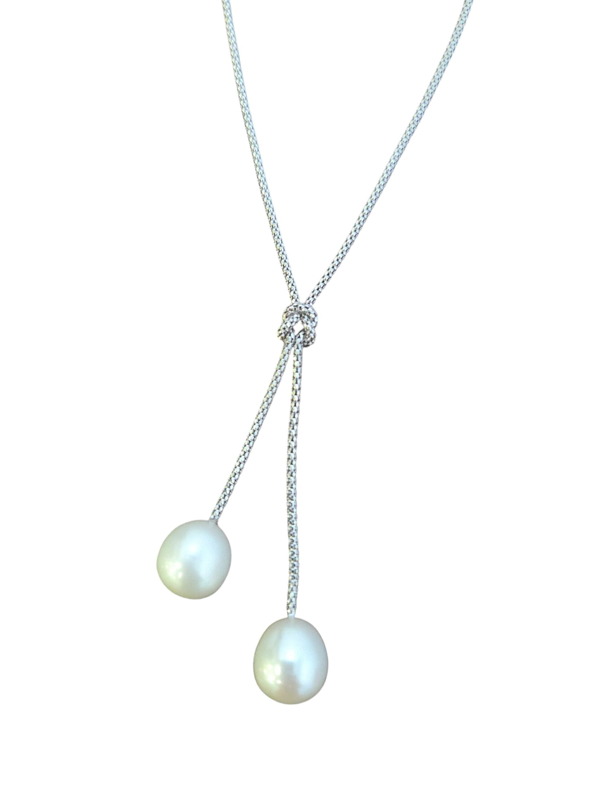 This two pearl necklace has a classic design. The necklace features a silver chain with a simple knot in the front with a white fresh water pearl hanging from each end. The pearls measure approximately 10 MM across. All metal is sterling silver