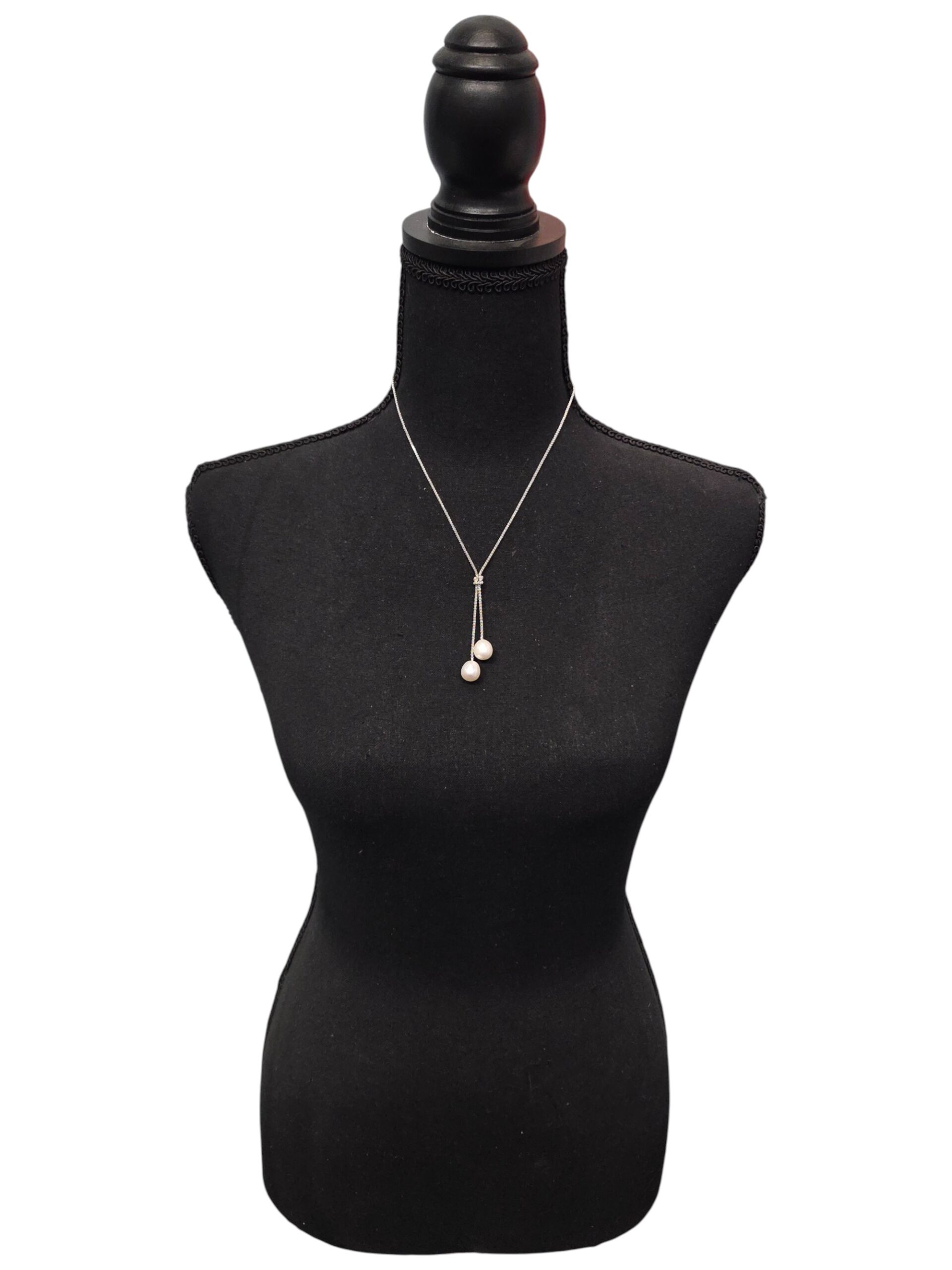 This two pearl necklace features a silver chain with a simple knot in the front with a white fresh water pearl hanging from each end. All metal is sterling silver. This necklace adjusts in length from approximately 17.5 to 18 inches in length. The fresh water pearls in the center hang down by approximately 2 inches.