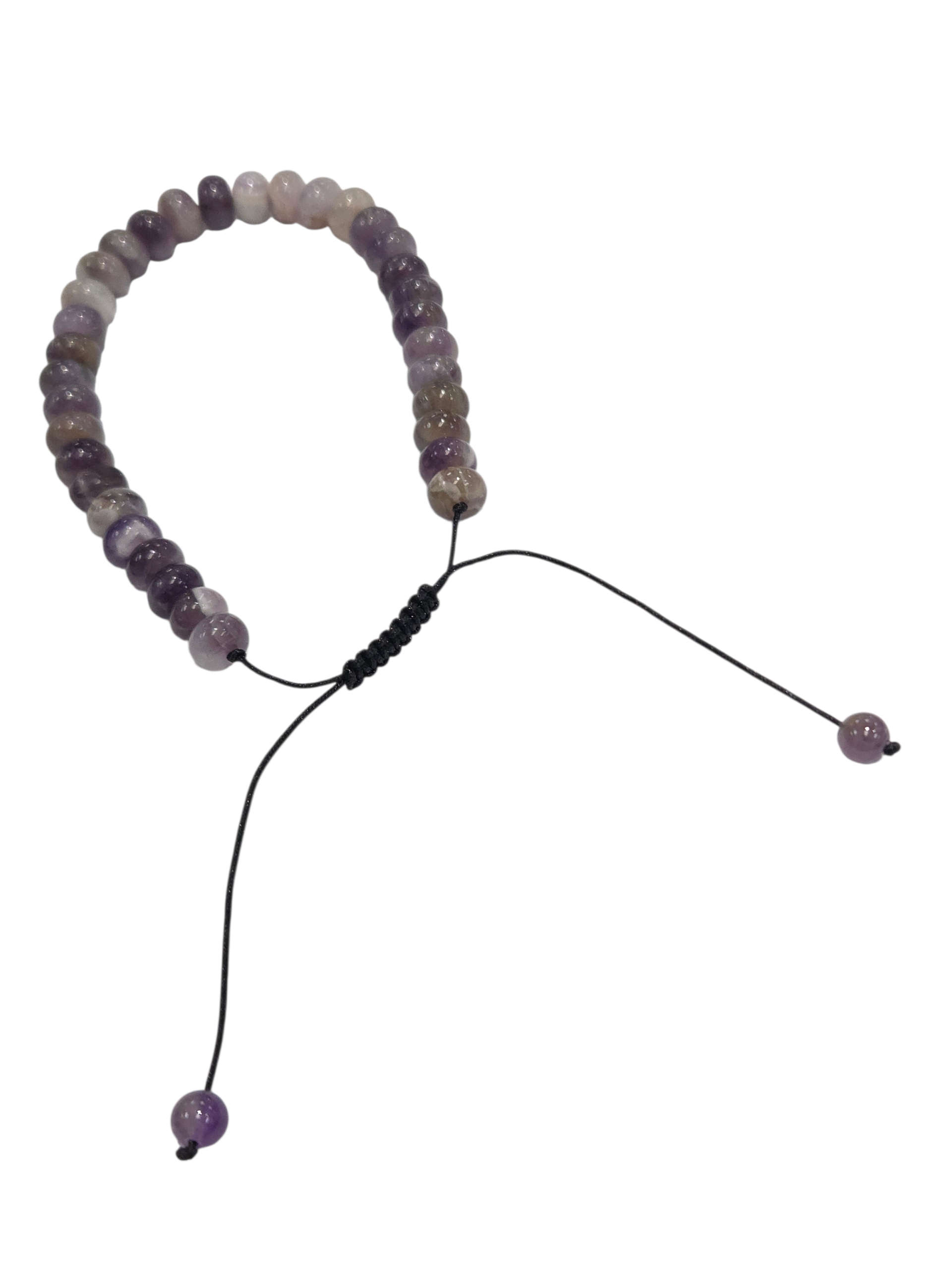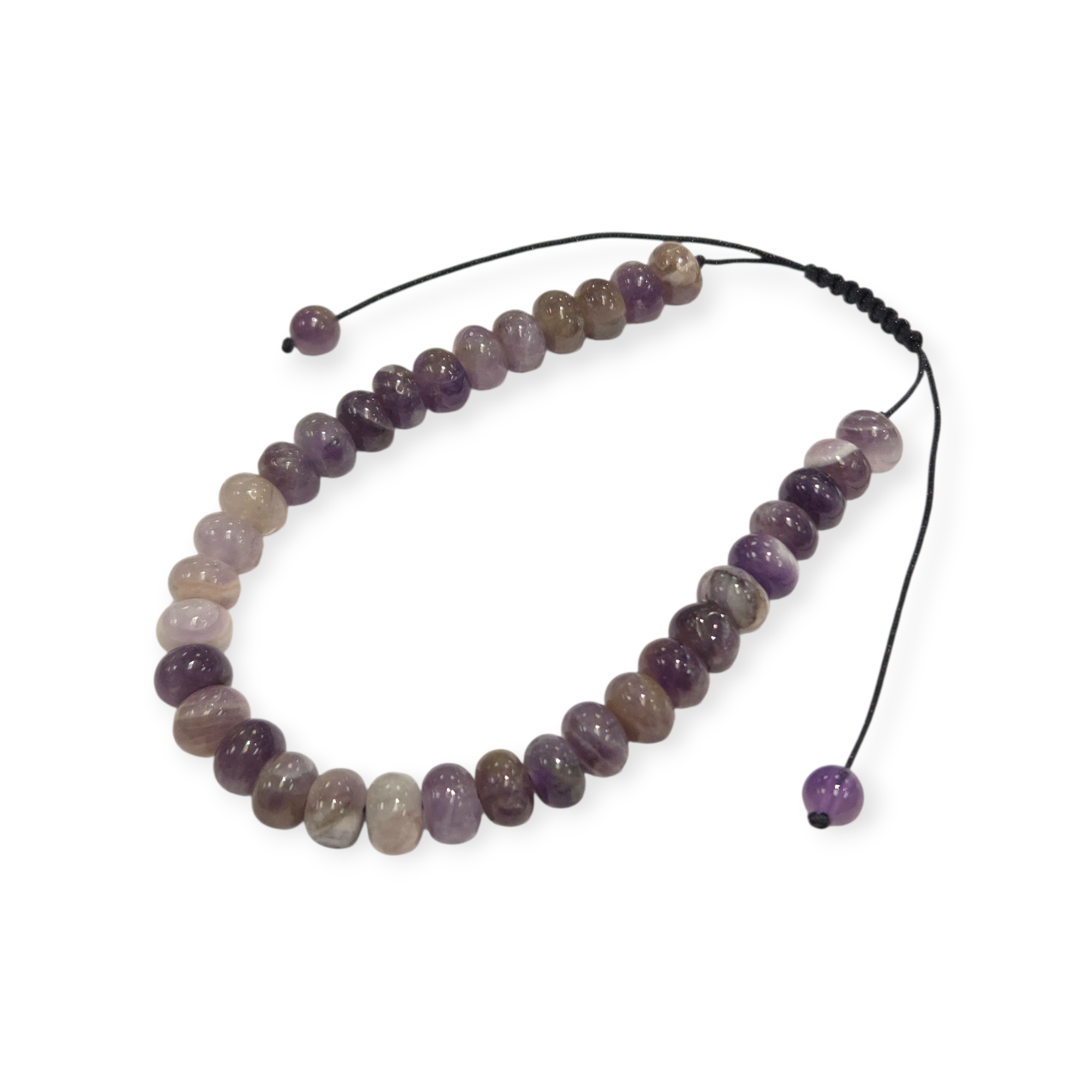 This handmade bracelet features amethyst gemstone beads on nylon cord featuring an adjustable macramé style knot that allows the bracelet to slip over a hand, than be adjusted tighter once it is on.
