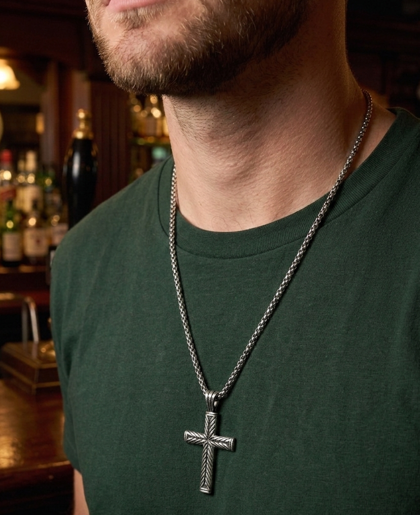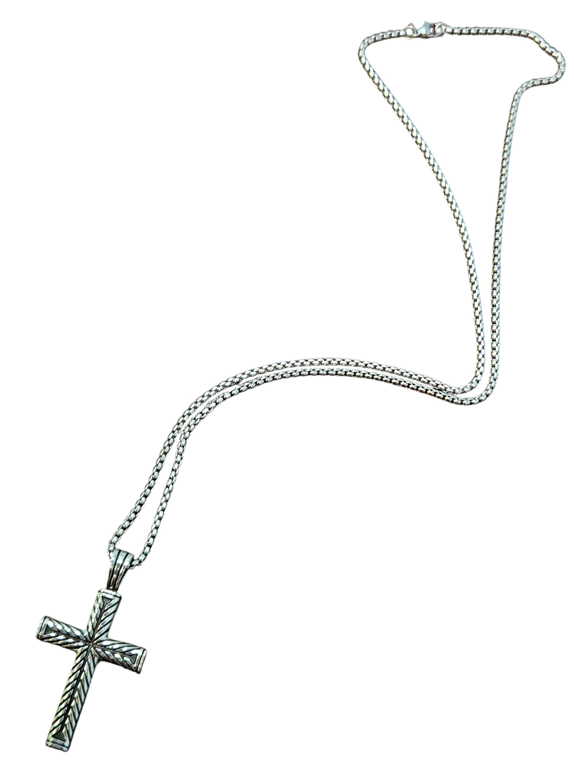 This unisex antiqued cross necklace is a great way to show your faith. The stainless steel cross has been antiqued to make the details look black. All metal used is hypo-allergenic stainless steel. The cross is on an approximately 24 inch long chain. The chain is approximately 3 MM wide. The cross pendant measures approximately 55 MM by 33 MM.