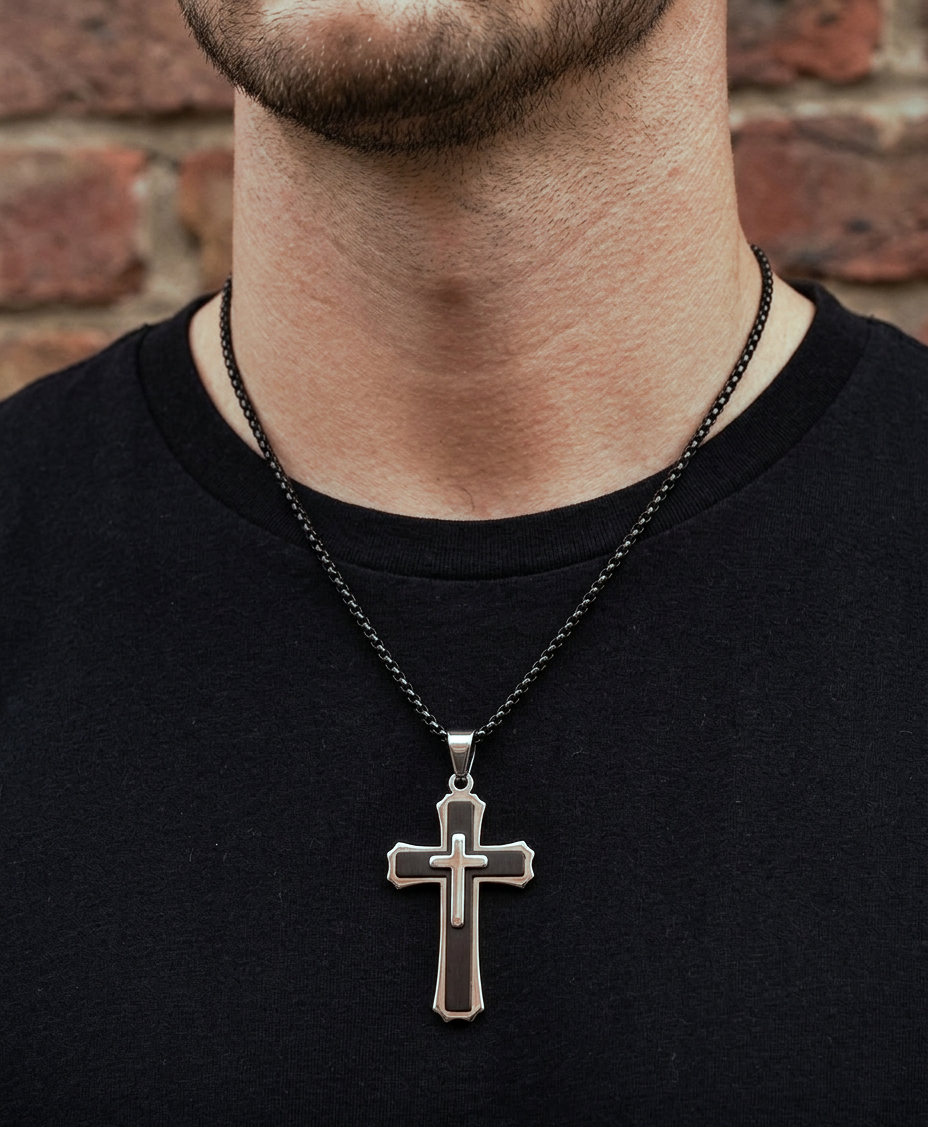 This unisex black and steel cross necklace is good for a man or woman. The black is plated stainless steel metal, with the steel color being stainless steel. All metal is hypo-allergenic and good for people with sensitive skin.