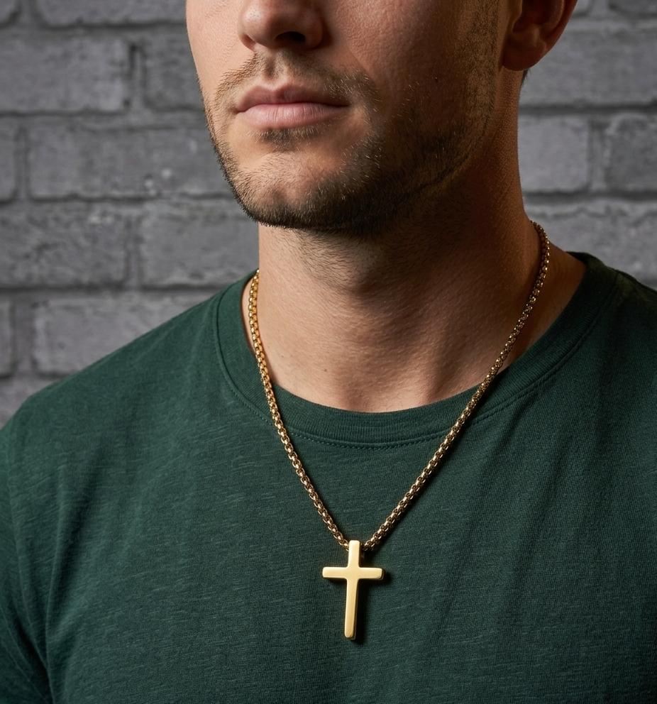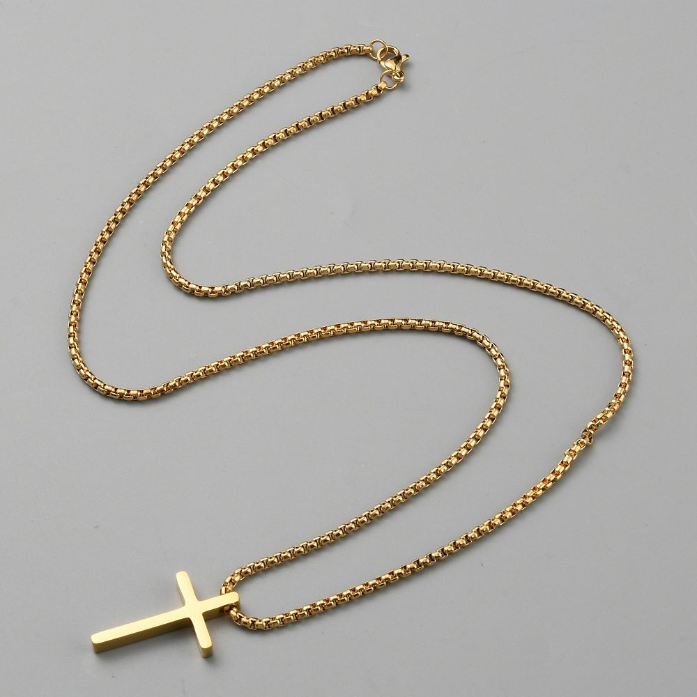 The cross sits right on the gold-plated stainless steel chain. The rounded box chain measures approximately 2.5 MM wide by 24 inches in length. The cross pendant measures approximately 1.16 inches long by .68 inches wide. The chain closes securely with an oversized lobster claw clasp.