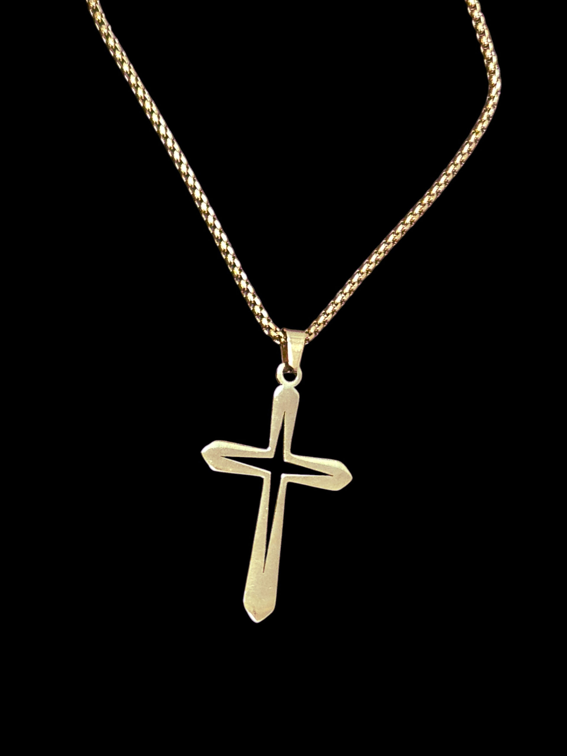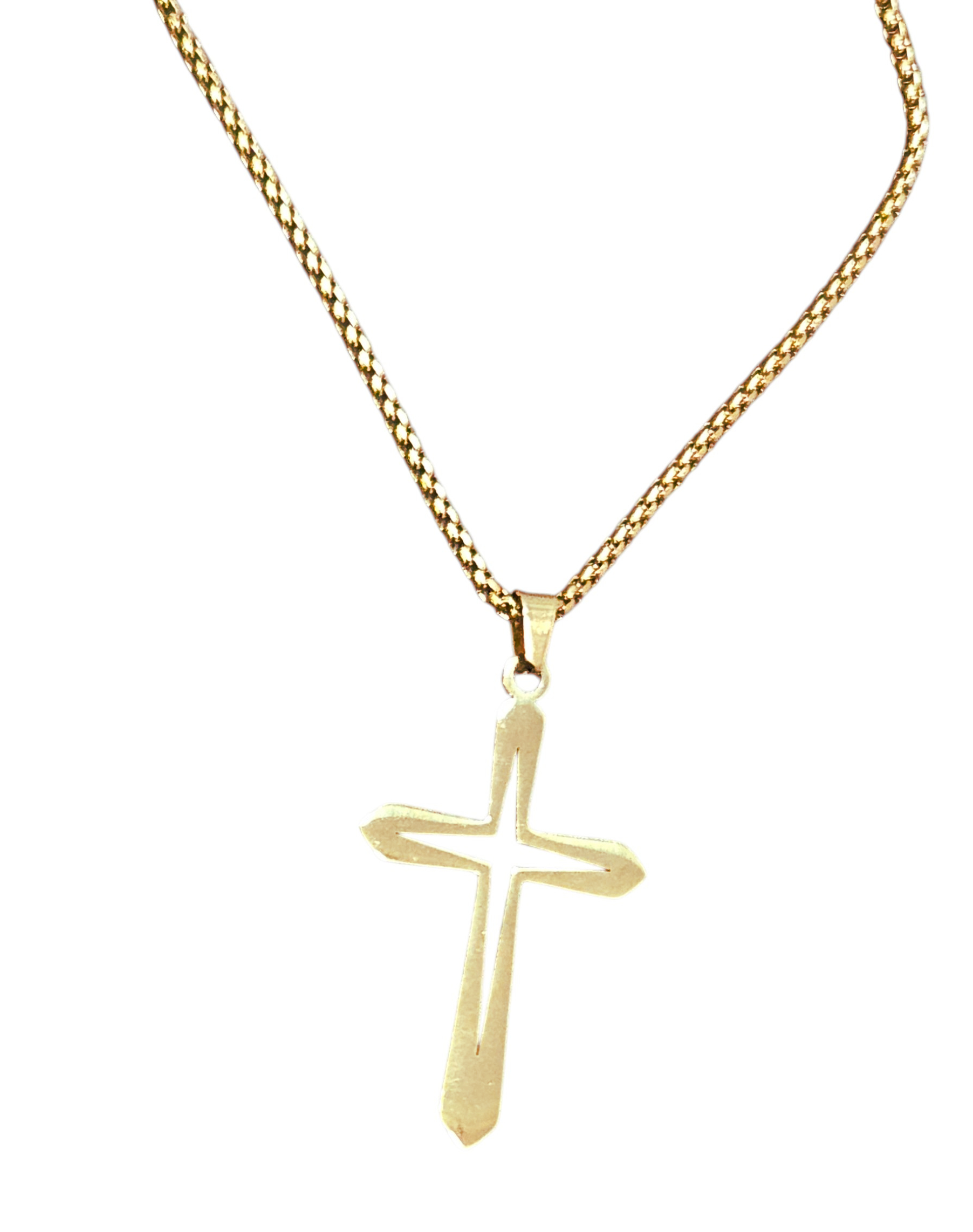 This unisex gold-plated open cross necklace is a great way to show your faith. The metal is gold-plated hypo-allergenic stainless steel. The gold-plated round box style chain measures approximately 24 inches in length by 2 MM wide. The cross pendant hanging from the chain measures approximately 2.25 inches long (including the bail) by 1.1 inches wide.