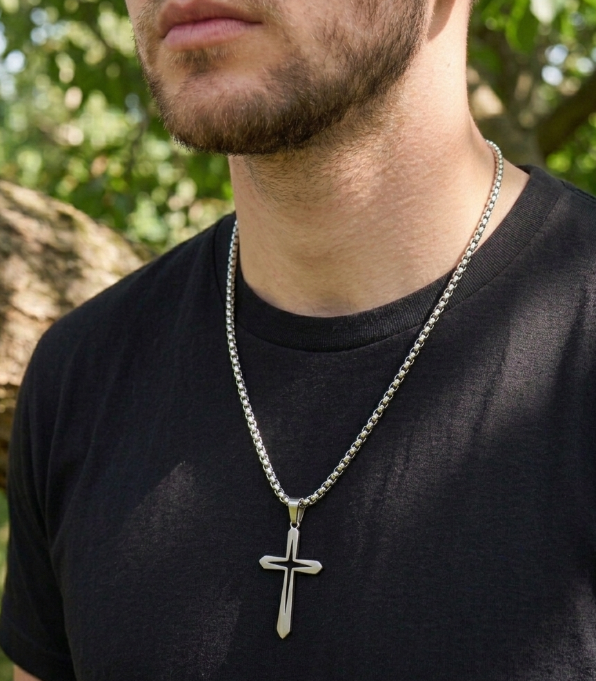 This unisex stainless steel open cross necklace is a great way to show your faith. The hypo-allergenic stainless steel round box style chain measures approximately 24 inches in length by 2 MM wide. The cross pendant hanging from the chain measures approximately 2.25 inches long (including the bail) by 1.1 inches wide.